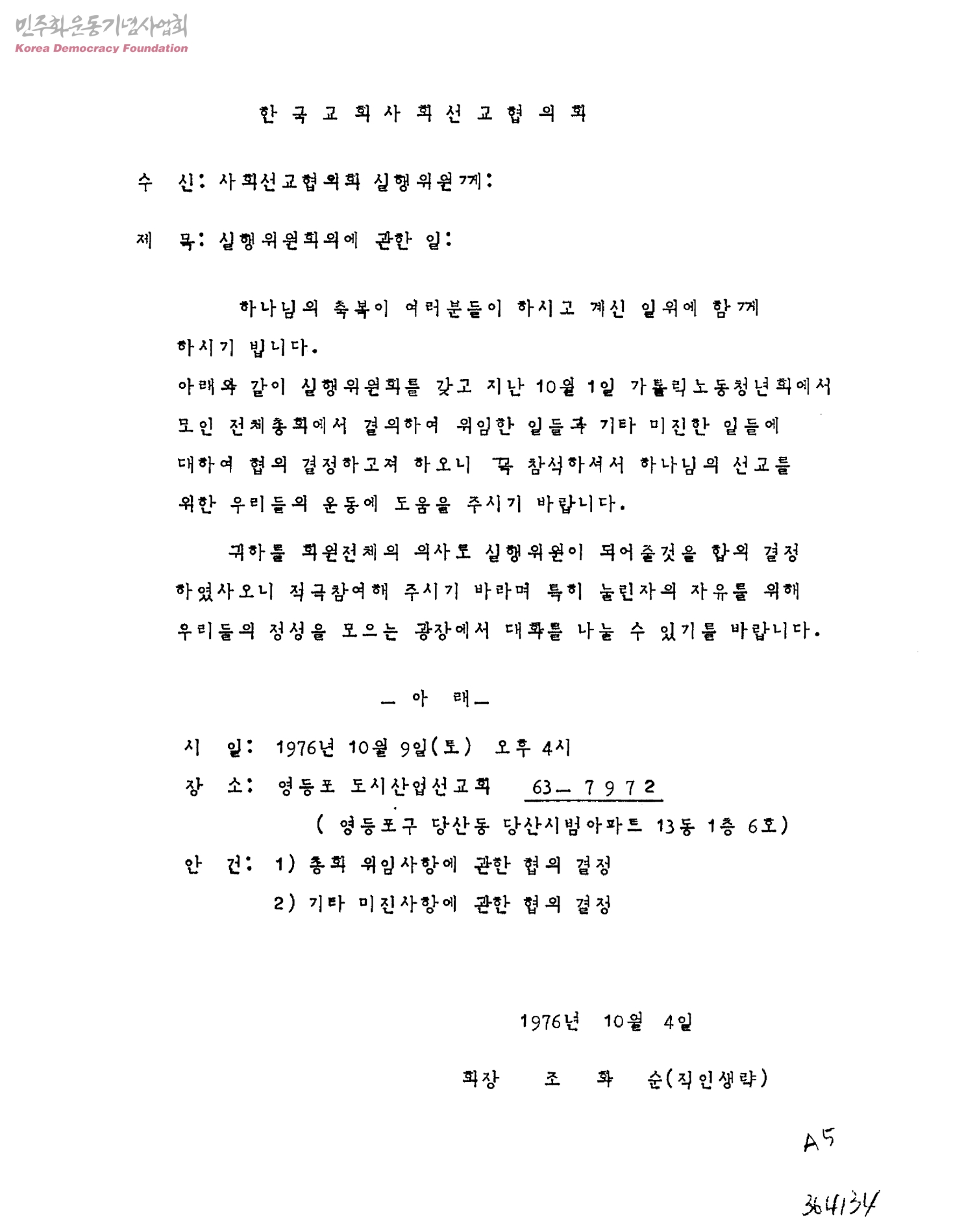 실행위원회의에 관한 일[수신:사회선교협의회 실행위원, 발신:회장 조화순]