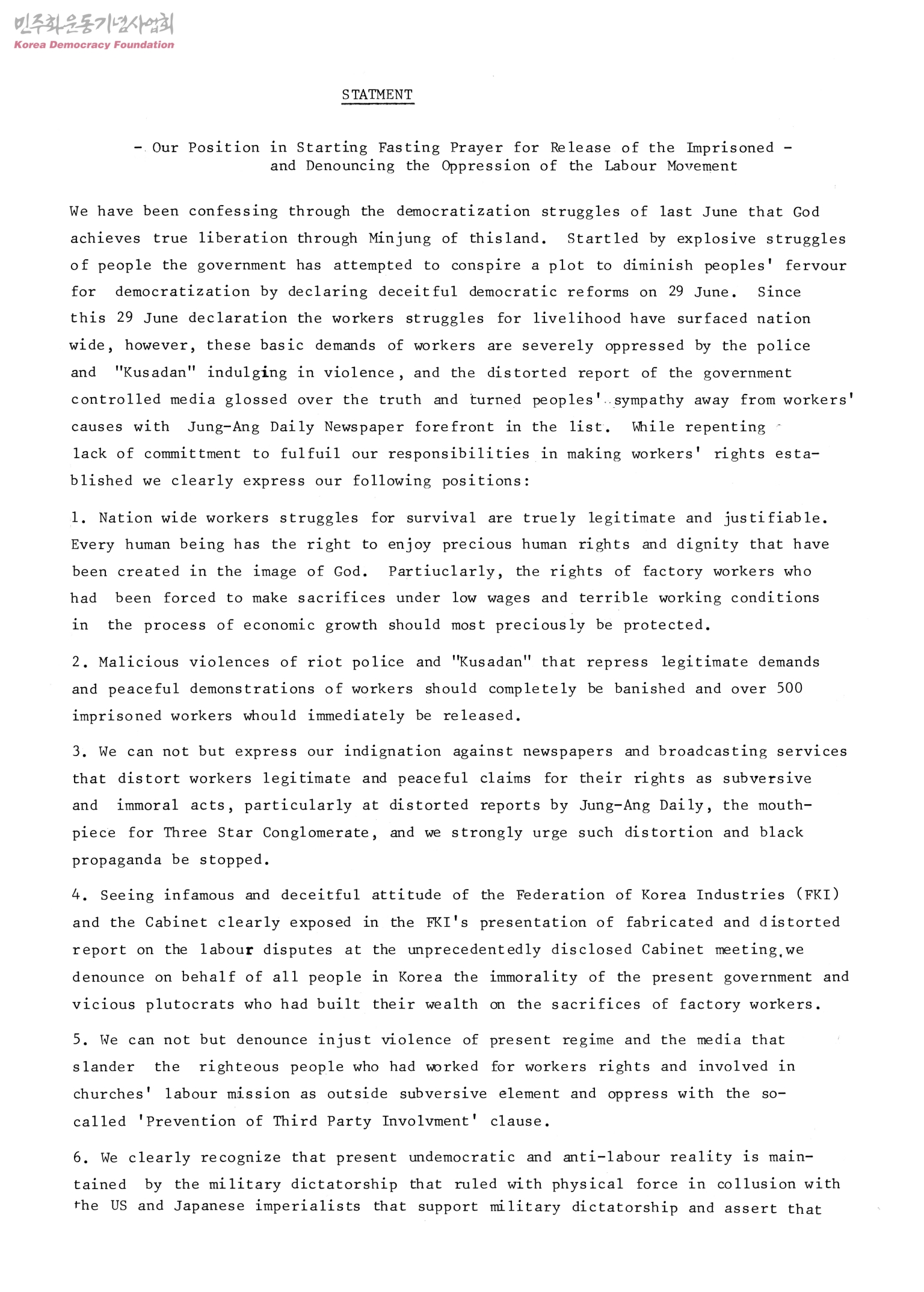 [statment-our position in starting, fasting prayer for release of the imprisonde and denouncing the oppression of the labour movement]