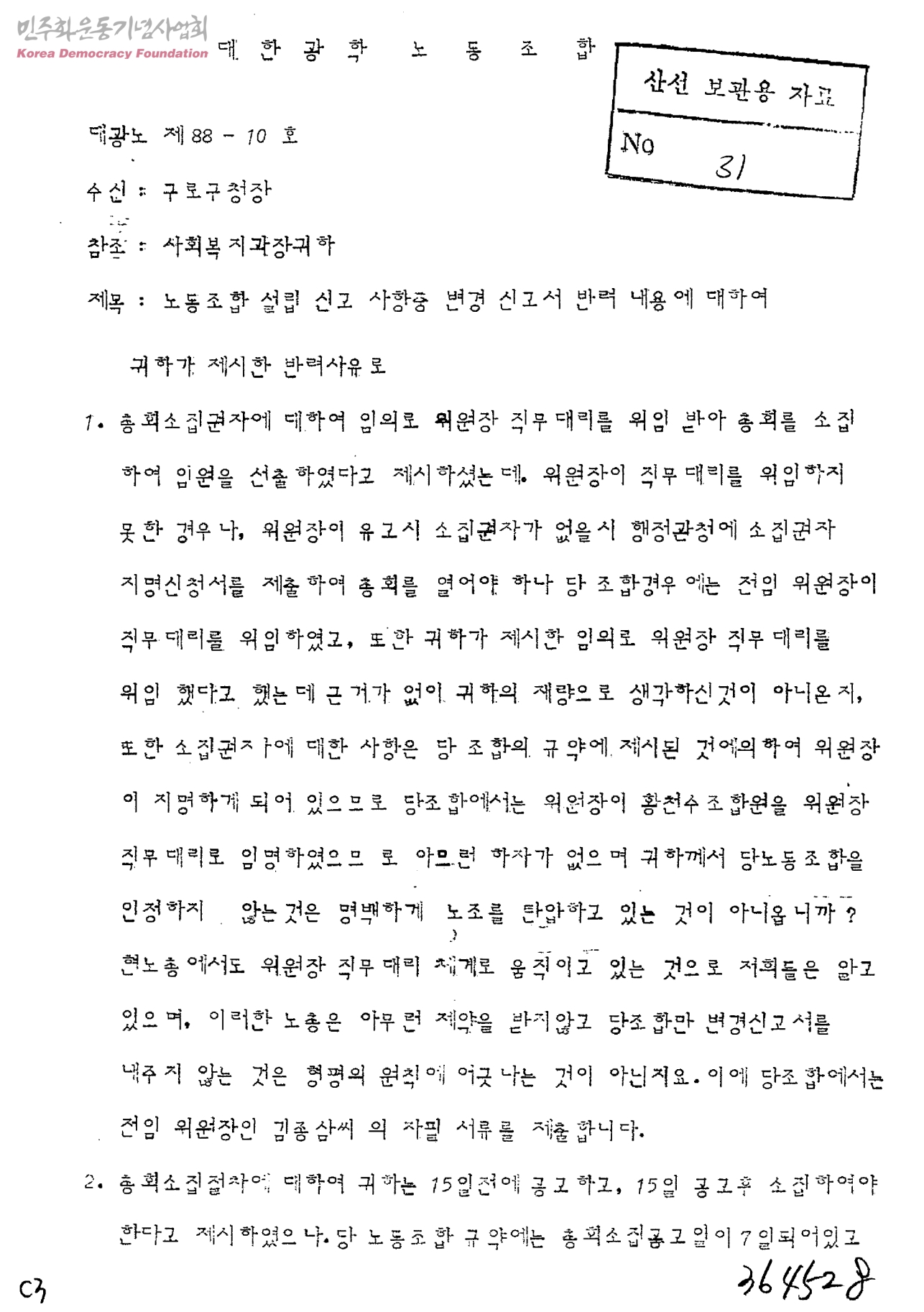 노동조합 설립 신고 사항중 변경 신고서 반려 내용에 대하여[수신:구로구청장, 발신:대한광학노동조합]