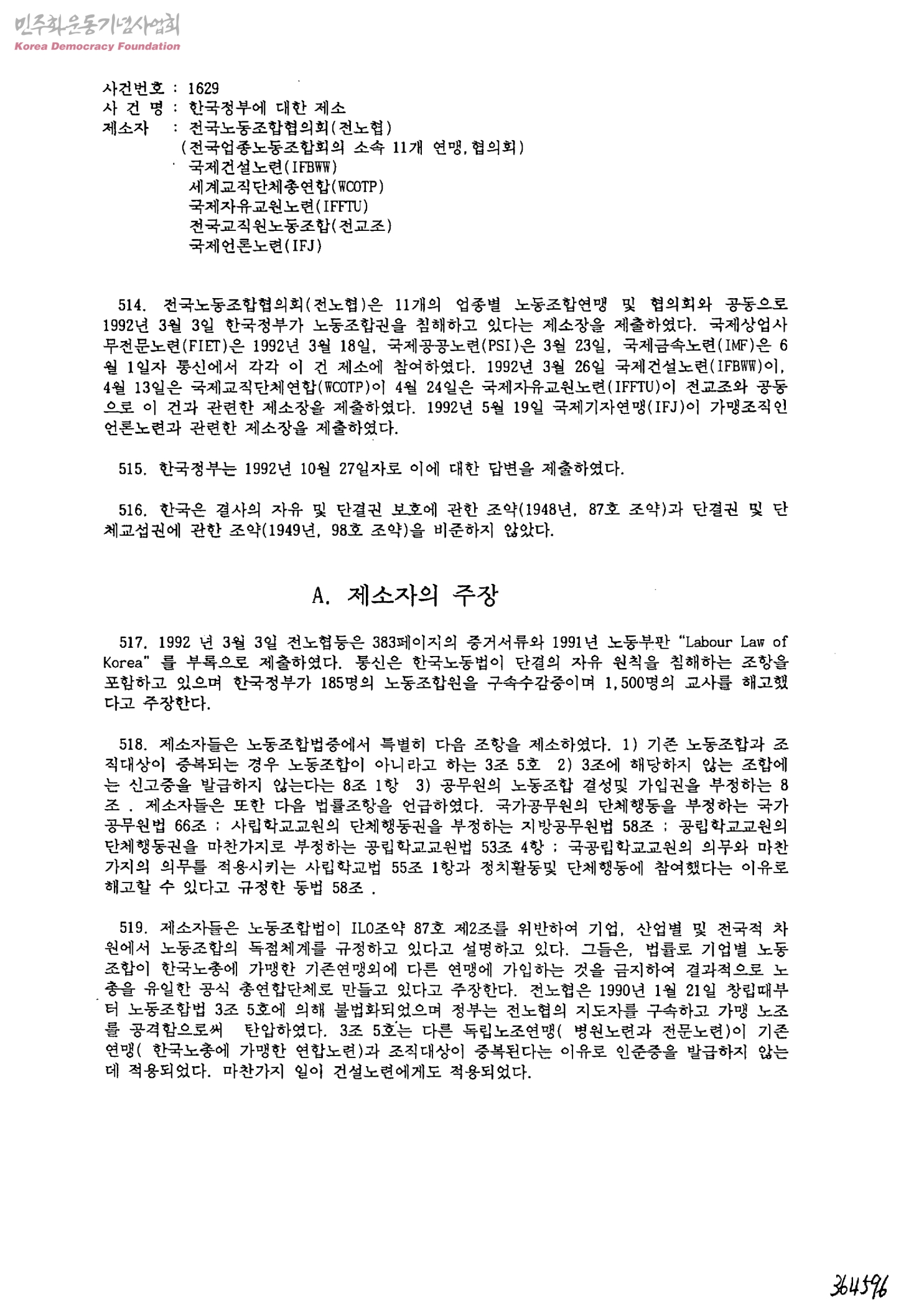 - 1. 제소자의 주장 2. 한국정부의 답변 3. 결사의 자유위원회 결정서 4. 위원회 권고안