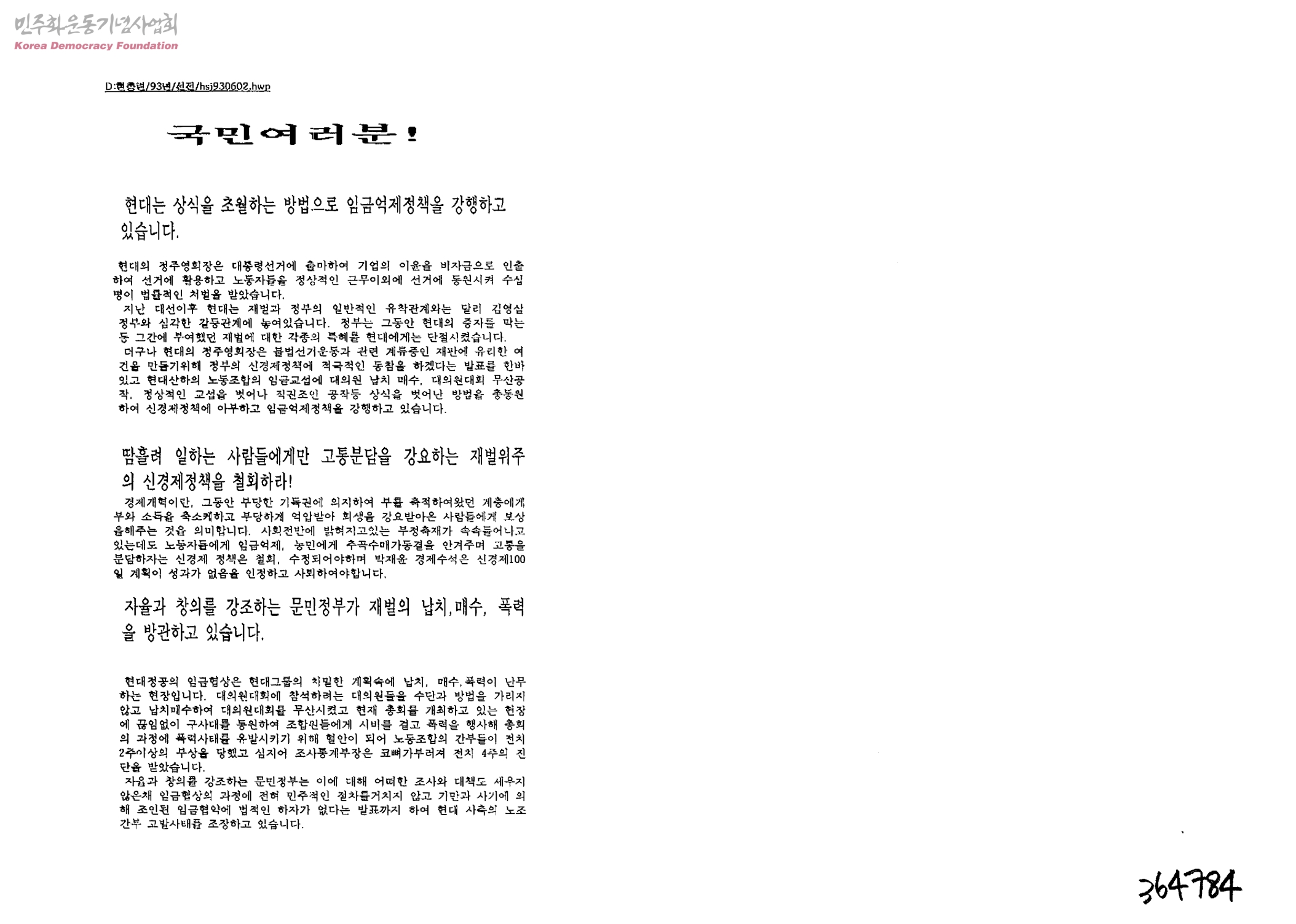 - 1)현대는 상식을 초월하는 방법으로 임금억제정책을 강행하고 있습니다 2)땀흘려 일하는 사람들에게만 고통분담을 강요하는 재벌위주의 신경제정책을 철회하라 3)자율과 창의를 강조하는 문민정부가 재벌의 납치, 매수, 폭력을 방관하고 있습니다. 등