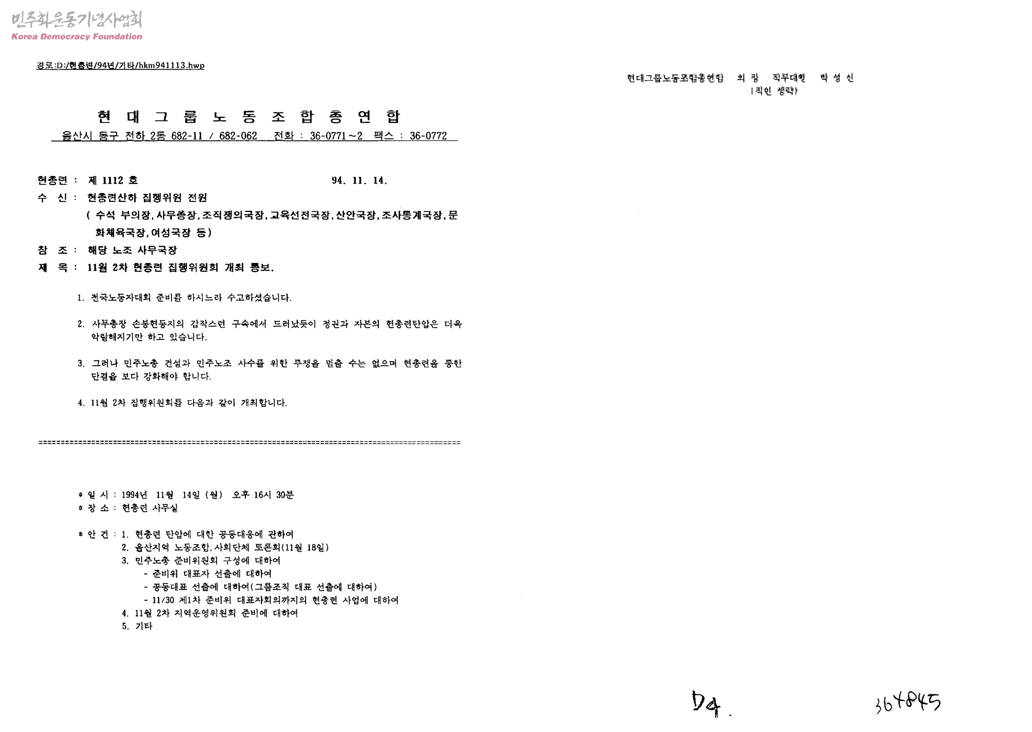 11월 2차 현총련 집행위원회 개최 통보[수신:현총련산하 집행위원 전원, 발신:현대그룹노동조합총연합]