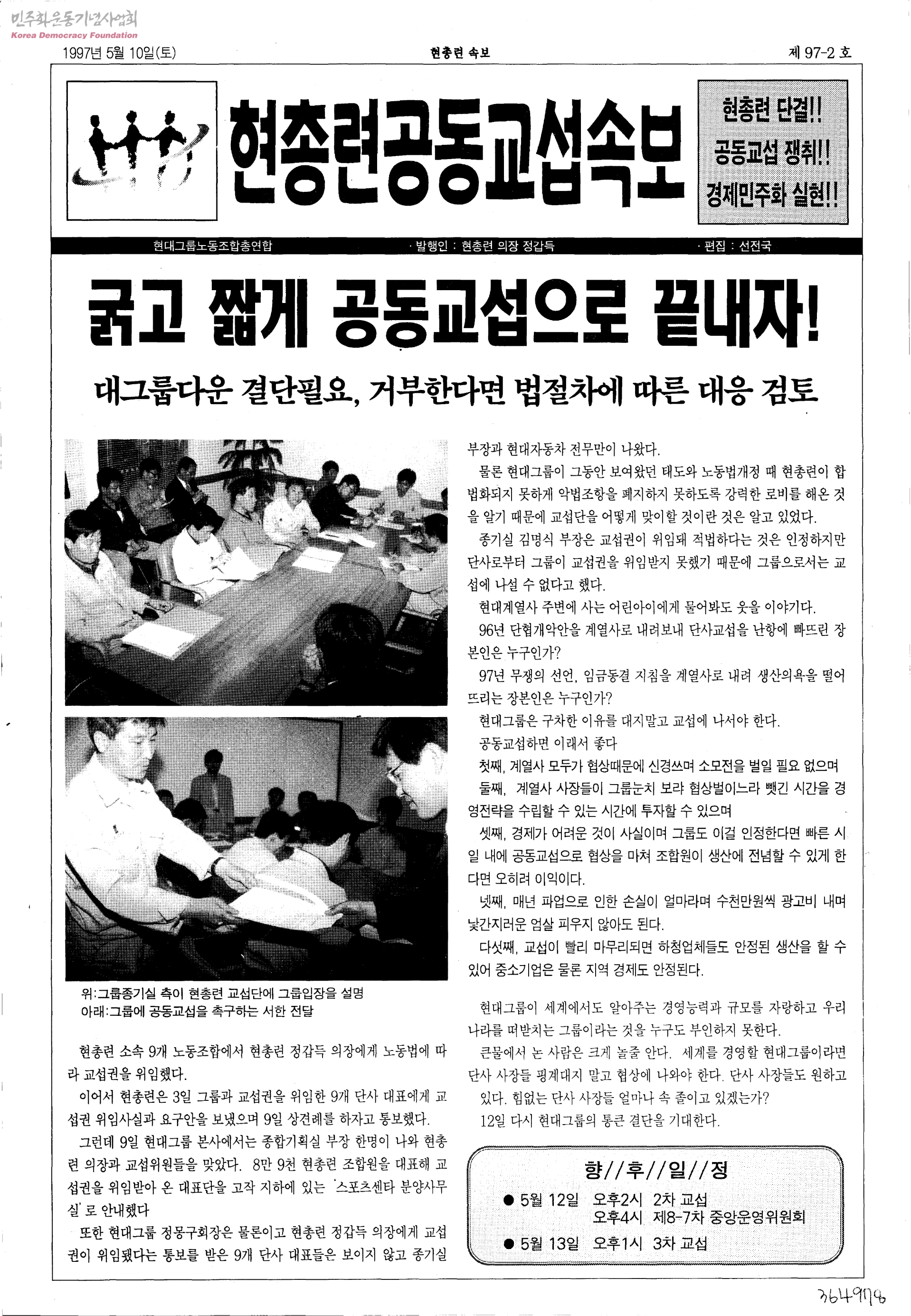 - 굵고 짧게 공동교섭으로 끝내자! 대그룹다운 결단필요, 거부한다면 법절차에 따른 대응 검토 현총련 97년 공동교섭 1차 방문