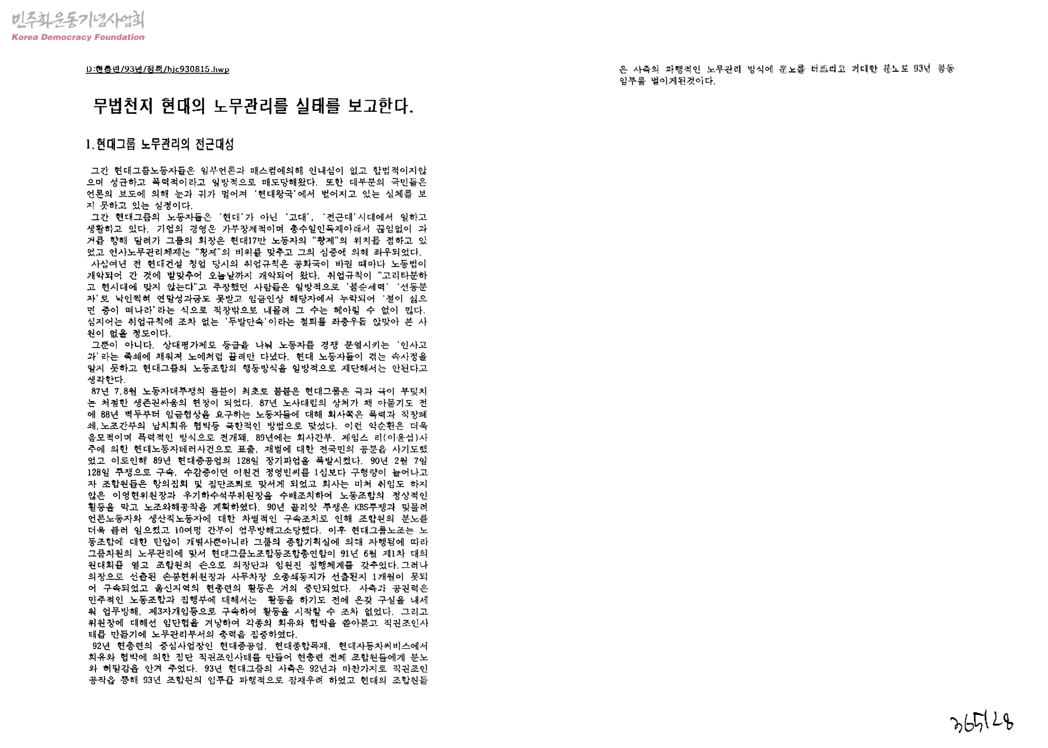 - 1.현대그룹 노무관리의 전근대성 2.종합기획실의 각사 노무관리 통제 2.생산현장의 민주화를 위한 노동조합의 인사,경영참여 3.폭력,납치,테러,구속 현대 노무관리 4.직권조인과 노무관리공작 - 현대그룹노무관리의 제2방식 5.복직불가자 그 이유는 타당한가 6.'노동자가 경제를 망친다' 7.산업평화 정착과 직장의 민주화발전을 위한 노무관리 시정 요청