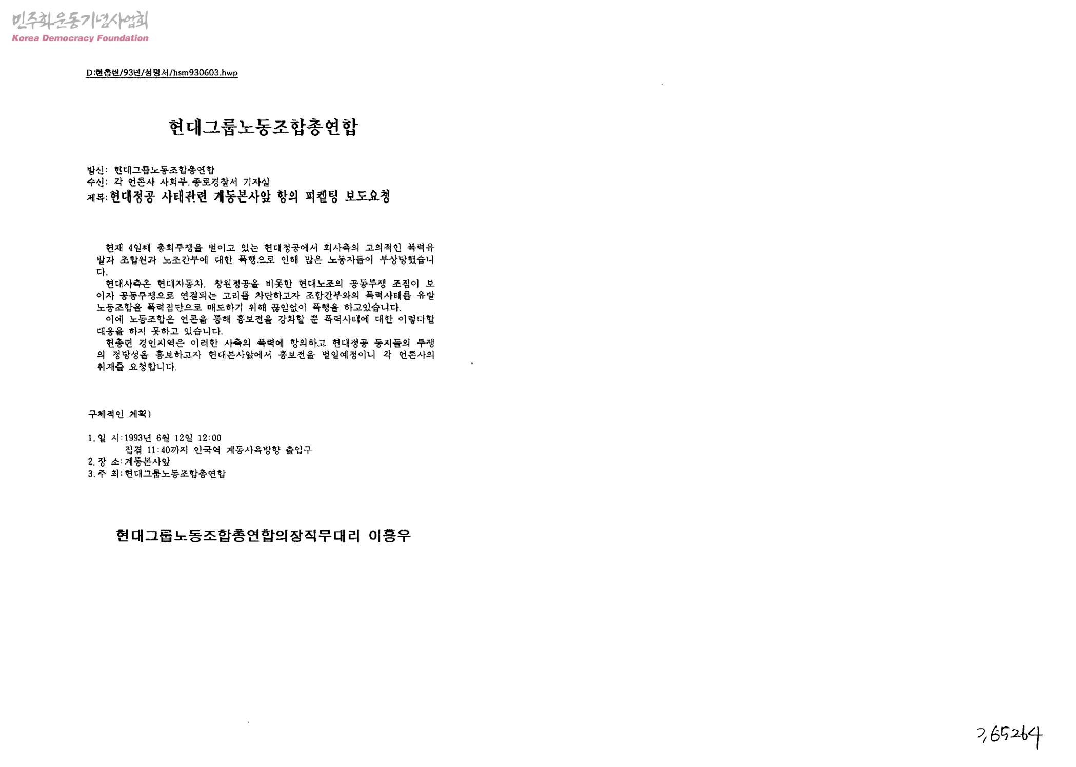 - 현총련 경인지역이 사측의 폭력에 항의하고 현대정공 동지들의 투쟁 정당성을 홍보하고자 각 언론사의 취재를 요청하는 내용