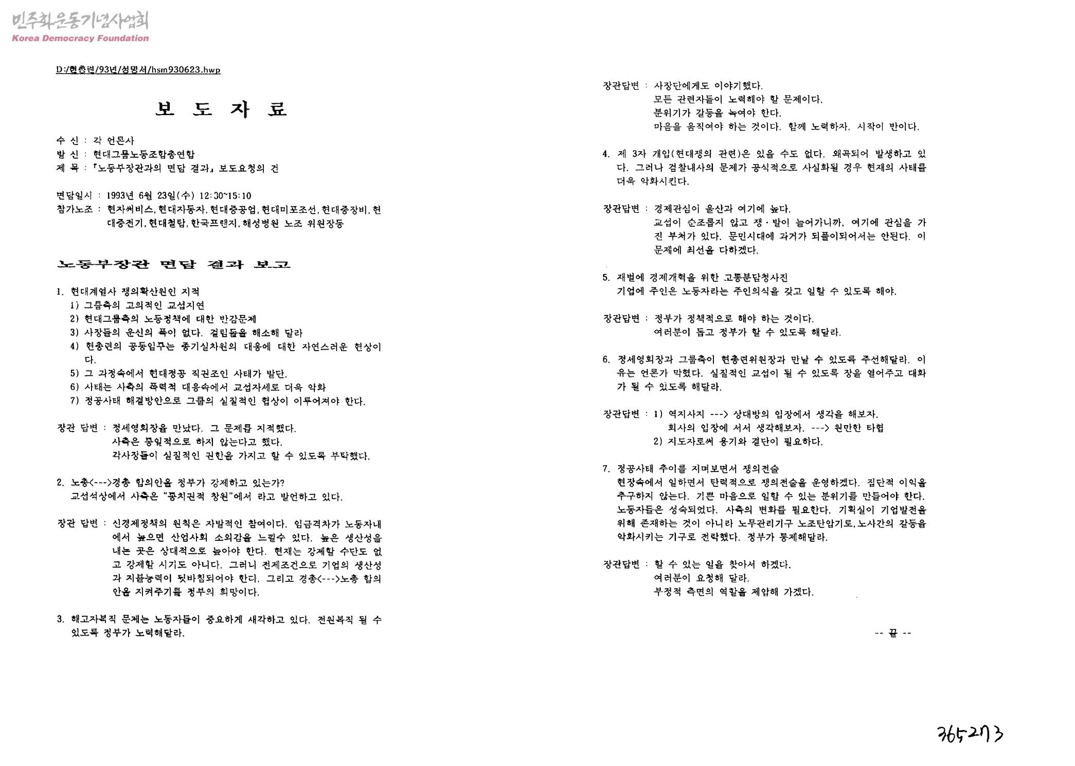 노동부장관과의 면담 결과 보도요청의 건[수신:각 언론사, 발신:현대그룹노동조합총연합]