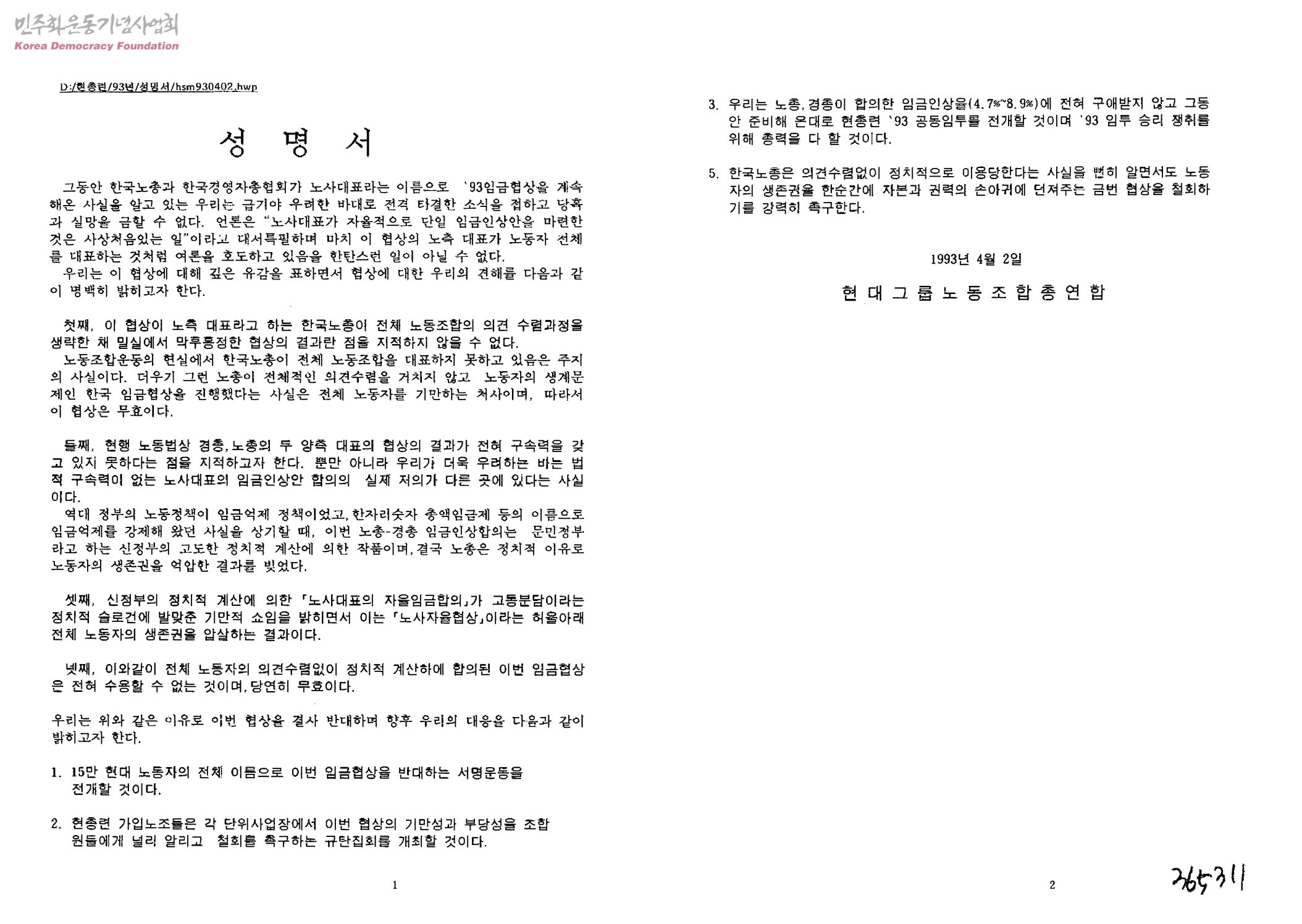 성명서[한국노총과 한국경영자총협회의 협상에 대한 현총련의 견해]