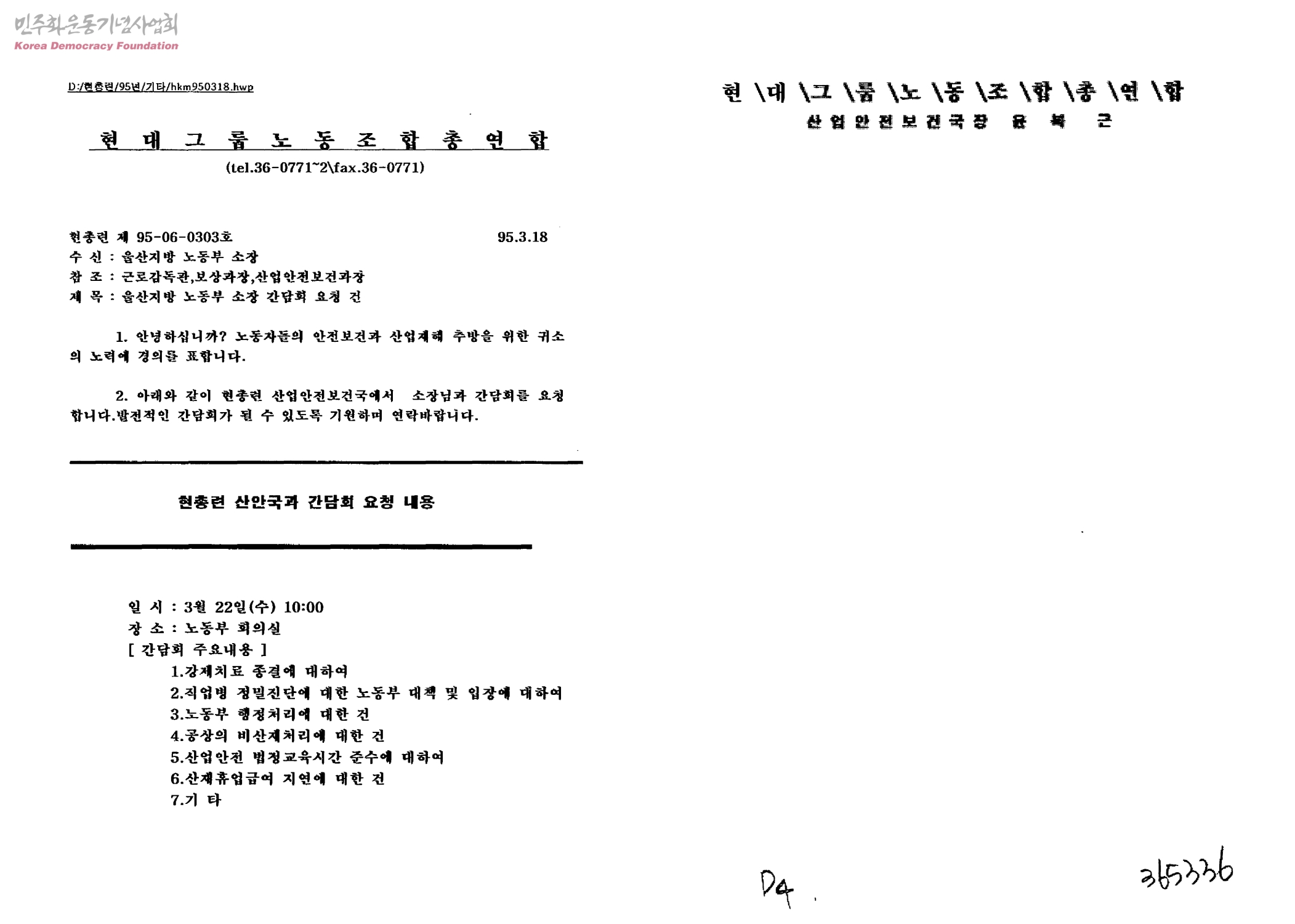 - 주요내용 1)강제치료 종결에 대하여 2)직업병 정밀진단에 대한 노동부 대책 및 입장에 대하여 3)노동부 행정처리에 대한 건 4)공상의 비산재처리에 대한 건 5)산업안전 법정교육시간 준수에 대하여 6)산재휴업급여 지연에 대한 건 등