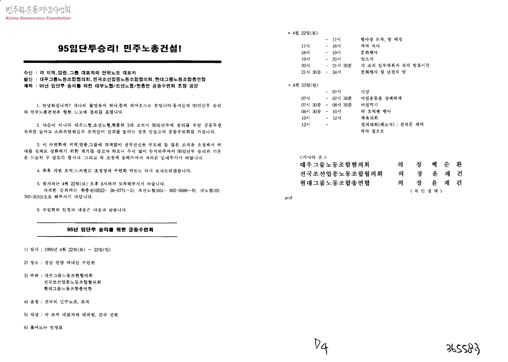 95년 임단투 승리를 위한 대우노협/조선노협/현총련 공동수련회 초청공문[수신:각 지역, 업종, 그룹 대표자와 단위노조 대표자, 발신:대우그룹노동조합협의회, 전국조선업종노동조합협의회, 현대그룹노동조합총연합]