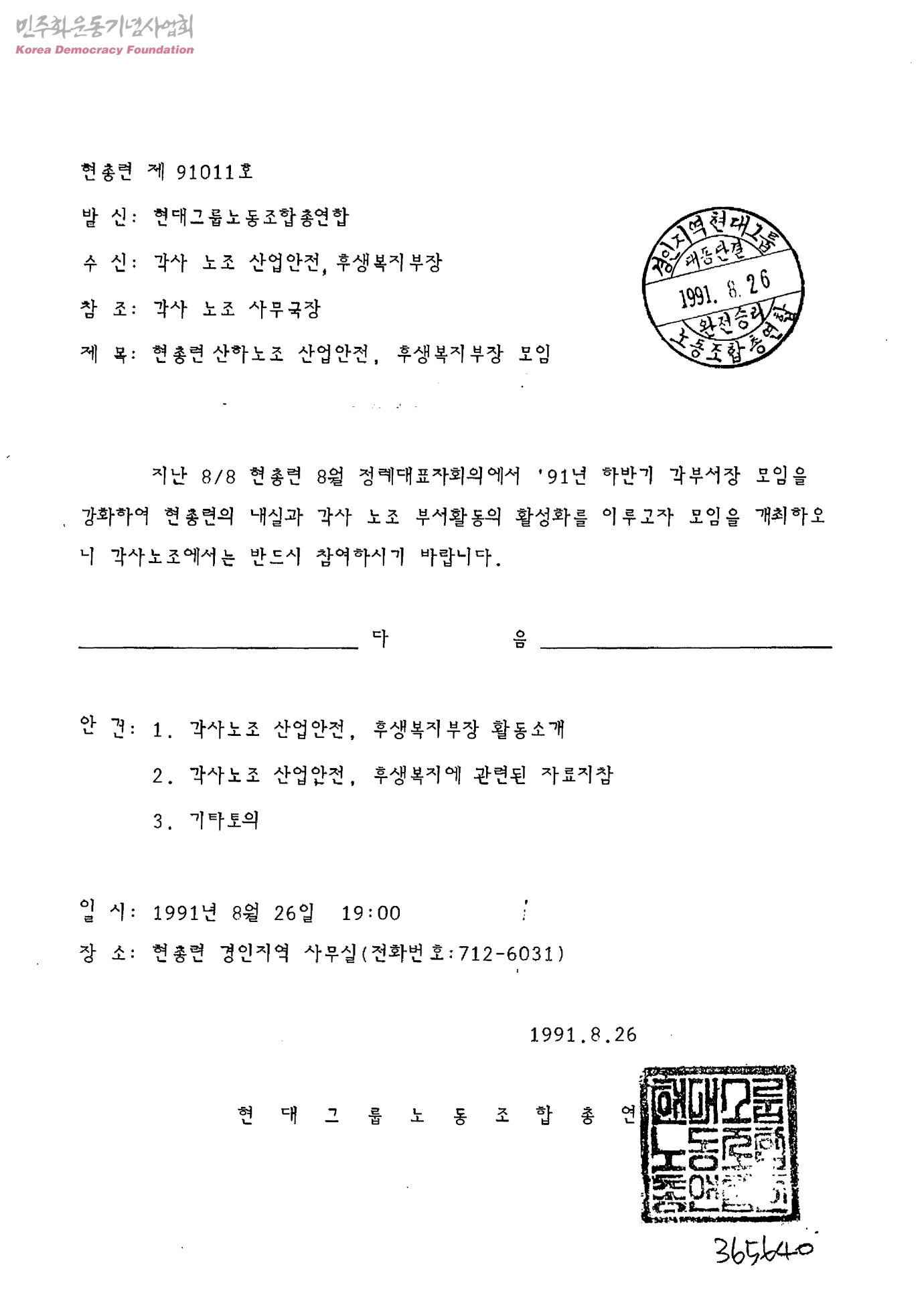 현총련 산하노조 산업안전, 후생복지부장 모임[수신:각사 노조 산업안전, 후생복지부장, 발신:현대그룹노동조합총연합]