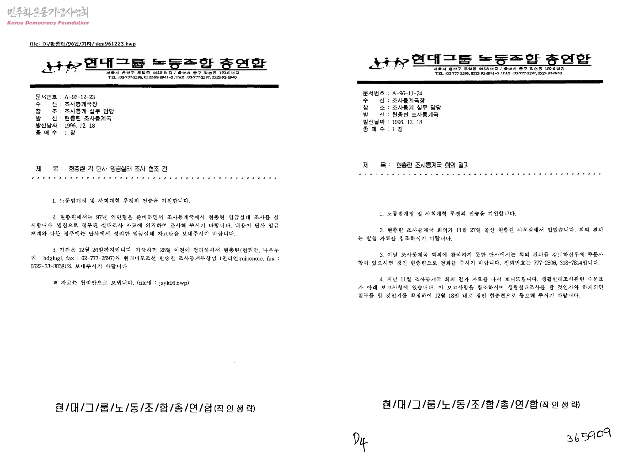 현총련 각 단사 임금실태 조사 협조 건[수신:조사통계국장, 발신:현총련 조사통계국]