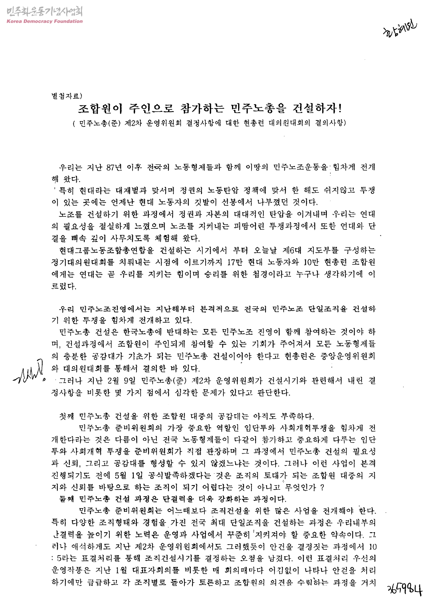 - 민주노총(준) 제2차 운영위원회 결정사항에 대한 현총련 대의원대회의 결의사항