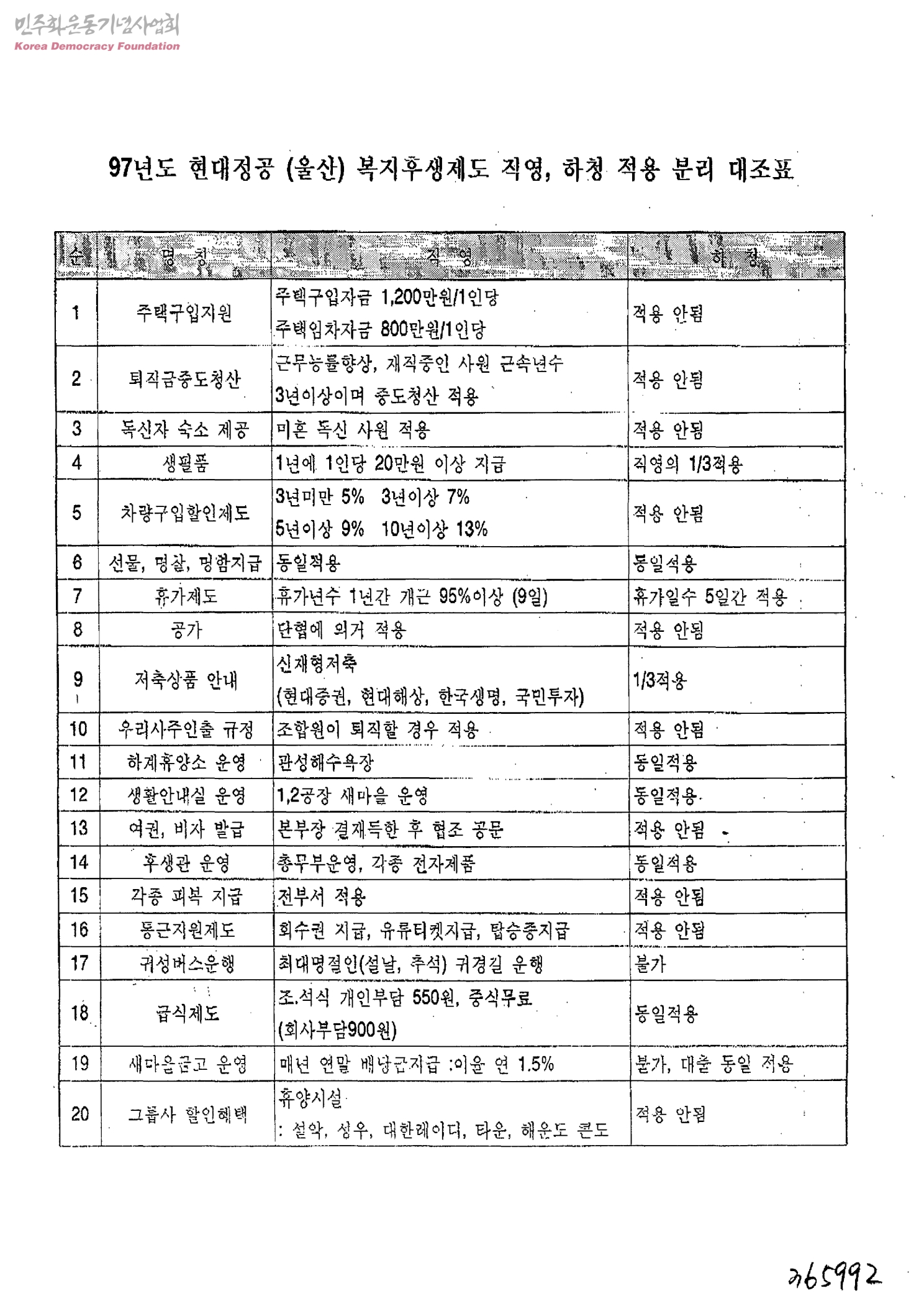 97년도 현대정공울상) 복지후생제도 직영, 하청 적용 분리 대조표