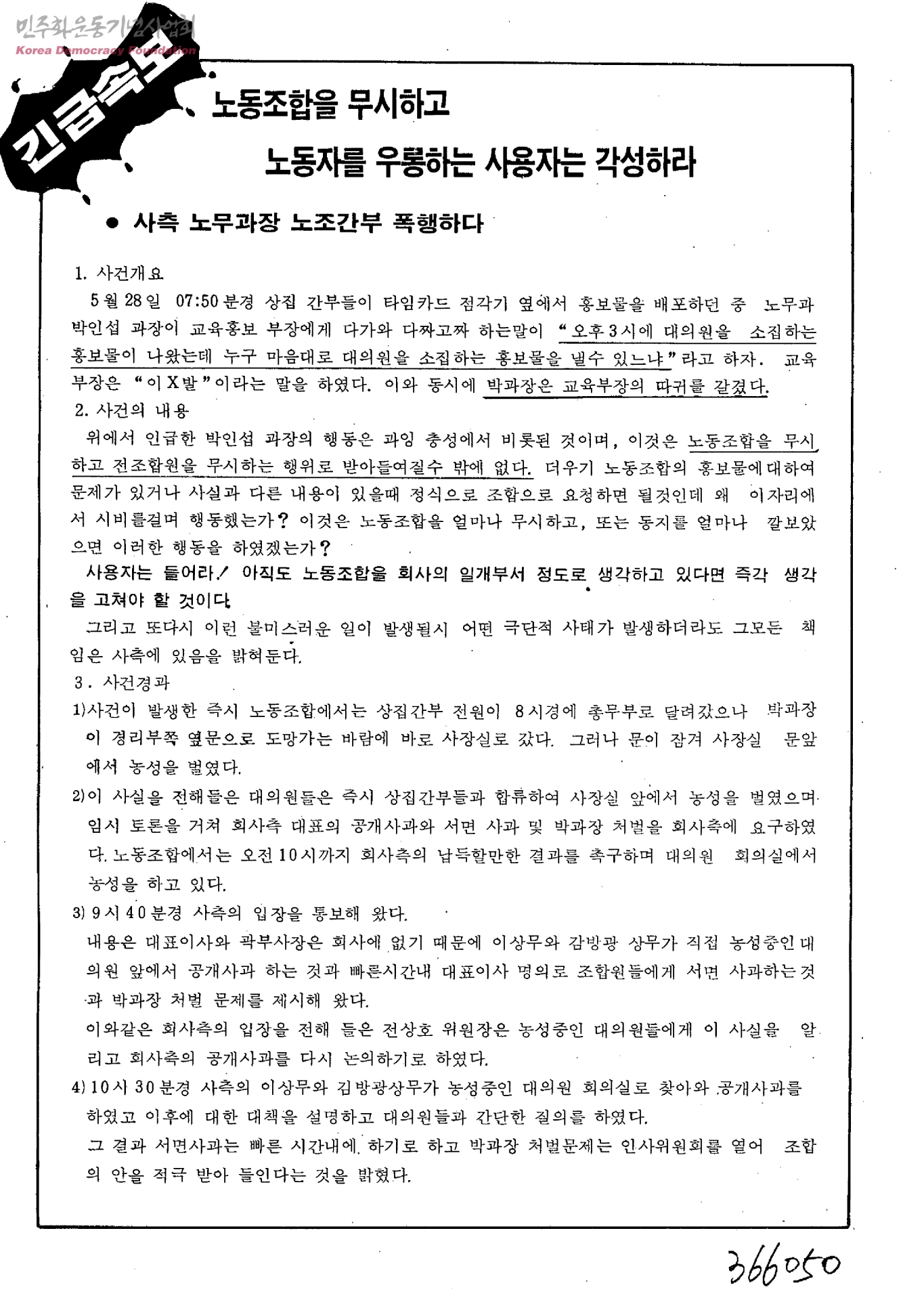 긴급속보-노동조합을 무시하고 노동자를 우롱하는 사용자는 각성하라(사측 노무과장 노조간부 폭행하다)
