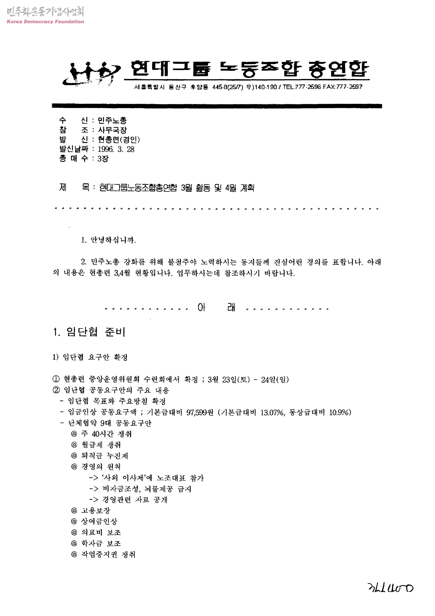 현대그룹노동조합총연합 3월 활동 및 4월 계획[수신:민주노동, 발신:현총련(경인)]