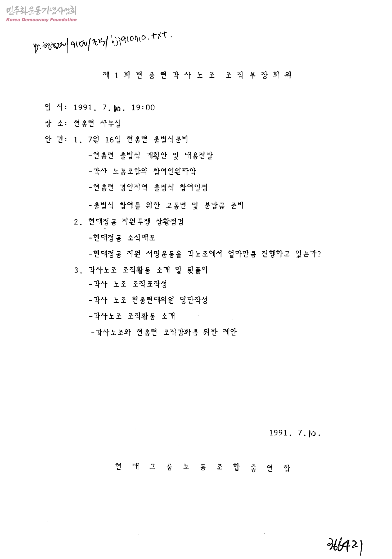 - 안건 1.7월16일 현총련 출범식준비 - 현총련 출범식 계획안 및 내용전달 - 각사 노동조합의 참여인원파악 - 현총련 경인지역 출정식 참여일정 - 출범식 참여를 위한 교통편 및 분담금 준비 2.현대정공 지원투쟁 상황점검 - 현대정공 소식배포 - 현대정공 지원 서명운동을 각 노조에서 얼마만큼 진행하고 있는가? 3.각사노조 조직활동 소개 및 뒷풀이 - 각사 노조 조직표 작성 - 각사 노조 현총련 대의원 명단 작성 - 각사 노조 조직활동 소개 - 각사노조와 현총련 조직강화를 위한 제안