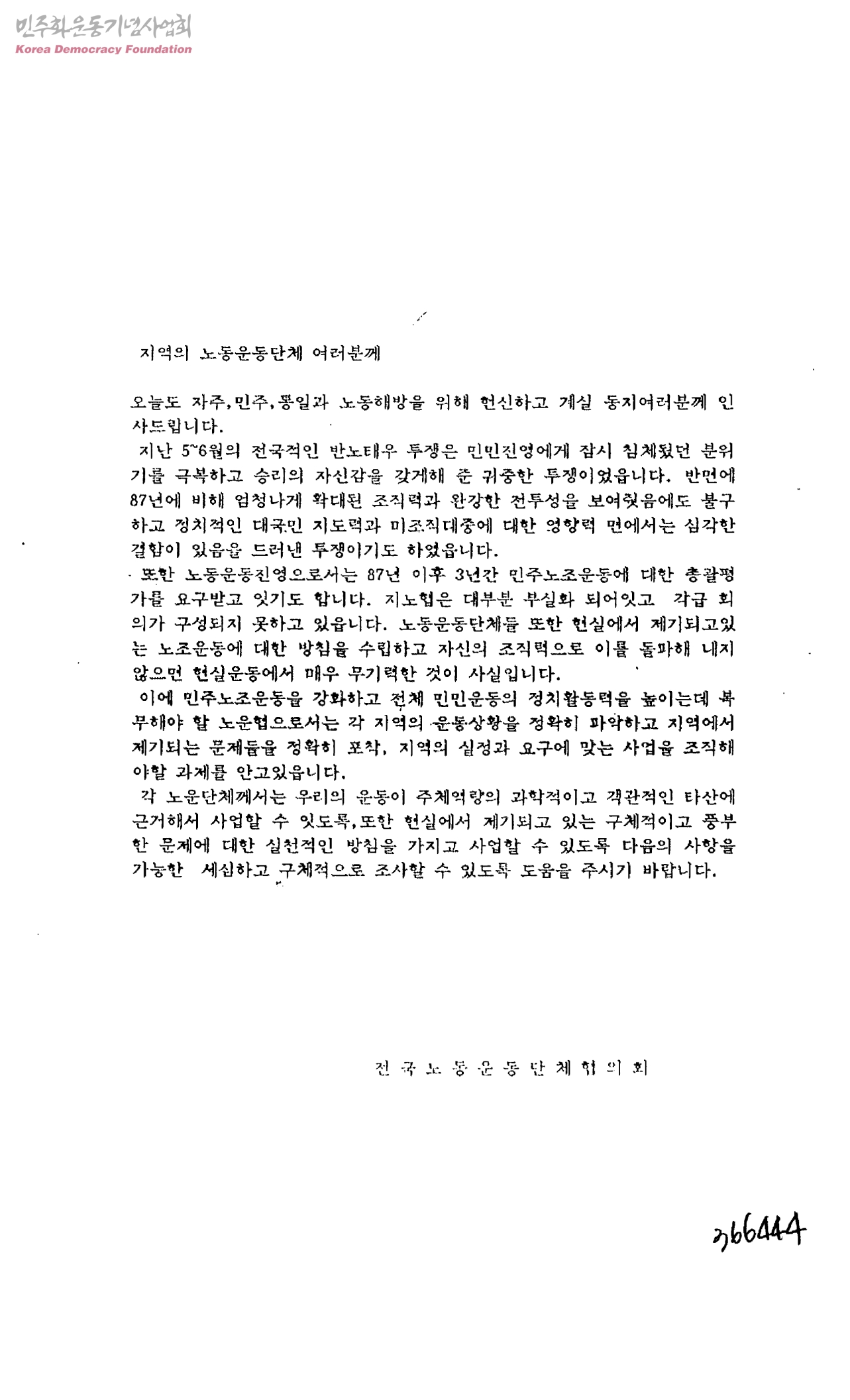 지역의 노동운동단체 여러분께[지역별 노동운동 실태조사]