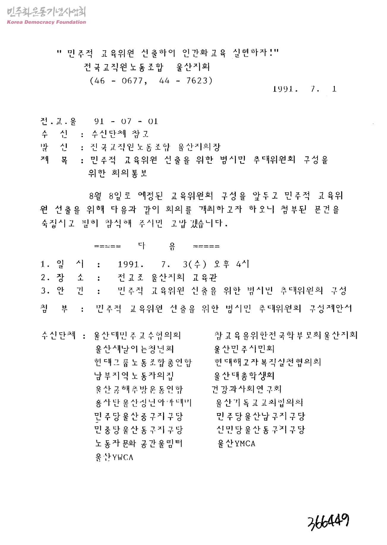 민주적 교육위원 선출을 위한 범시민 추대위원회 구성을 위한 회의통보[수신:울산대민주교수협의회 외 18, 발신:전국교직원노동조합 울산지회장]