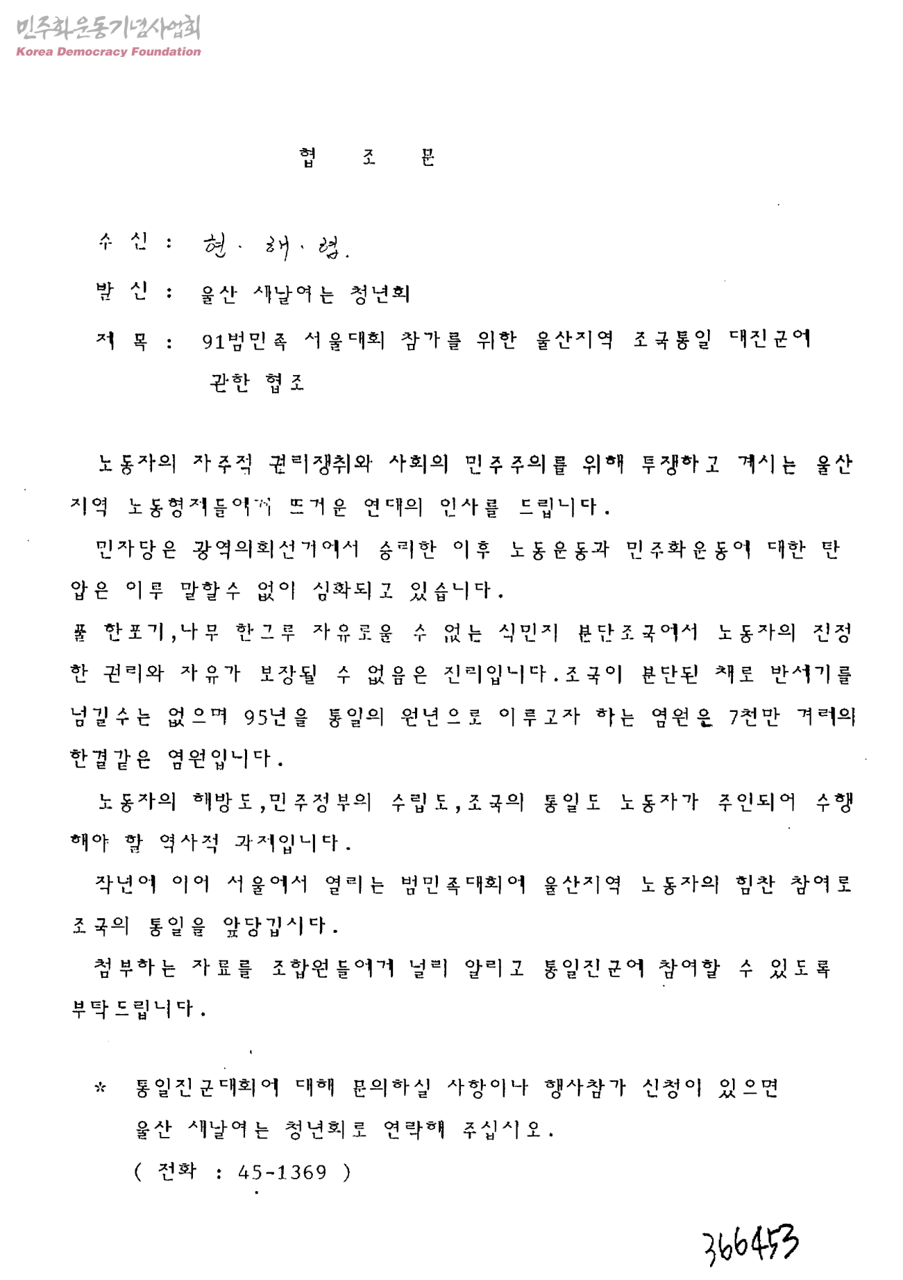 협조문-91범민족 서울대회 참가를 위한 울산지역 조국통일 대진군에 관한 협조[수신:현·해·협, 발신:울산 새날여는 청년회]