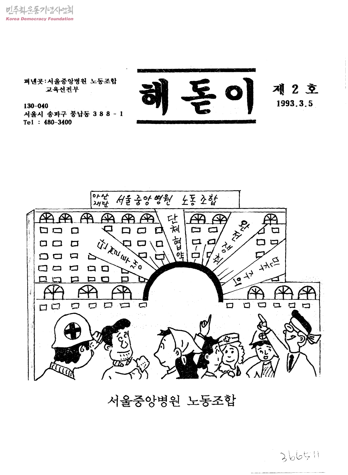 - 차례 권두시/함께 가자 우리 이 길을 노동조합소식 타 노조소식 대의원 대회보고 짚고 넘어갑시다/새마을 금고에 대하여 특집/노동운동사 "청년 노동자 전태일" 부서탐방/해부병리과를 찾아서 시사/신 노동정책이란 무엇인가 노동법/임금 조합원의 글/간담회를 마치고, 천마산을 다녀와서 책의 해 93년 예산안 풀어봅시다 나의 결의 알림판