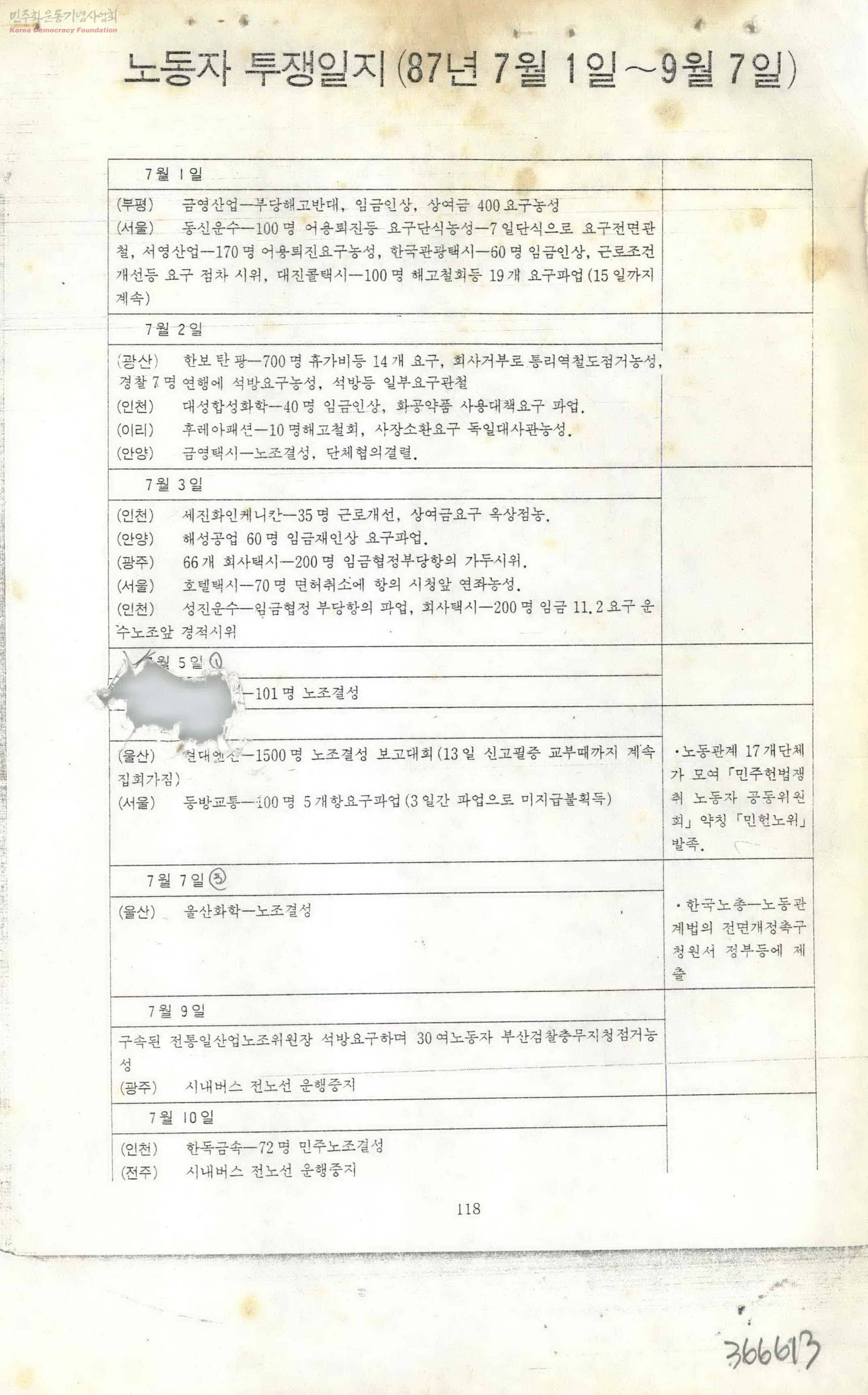 노동자 투쟁일지(87년 7월 1일~9월7일)
