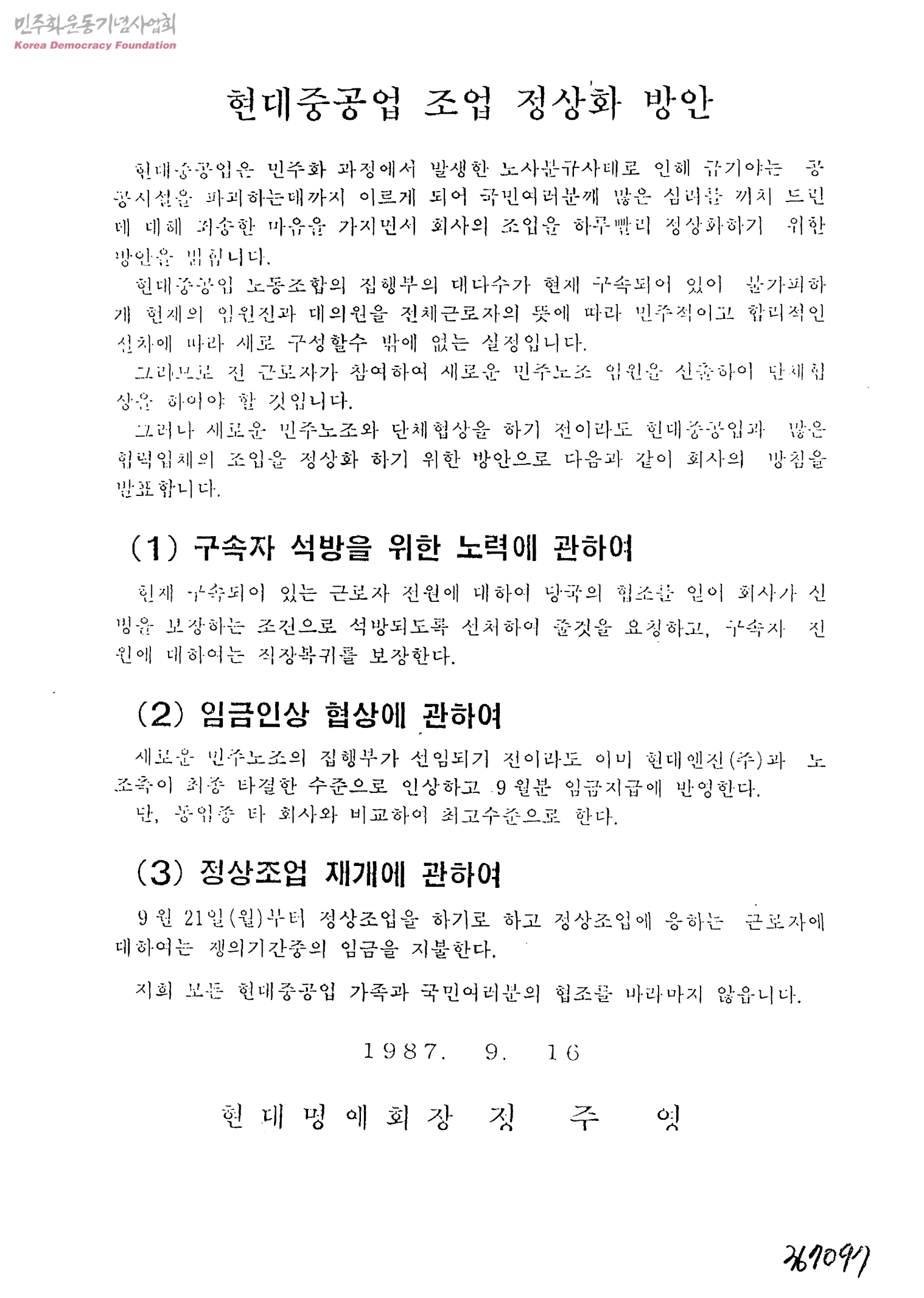 - 1)구속자 석방을 위한 노력에 관하여 2)임금인상 협상에 관하여 3)정상조업 재개에 관하여