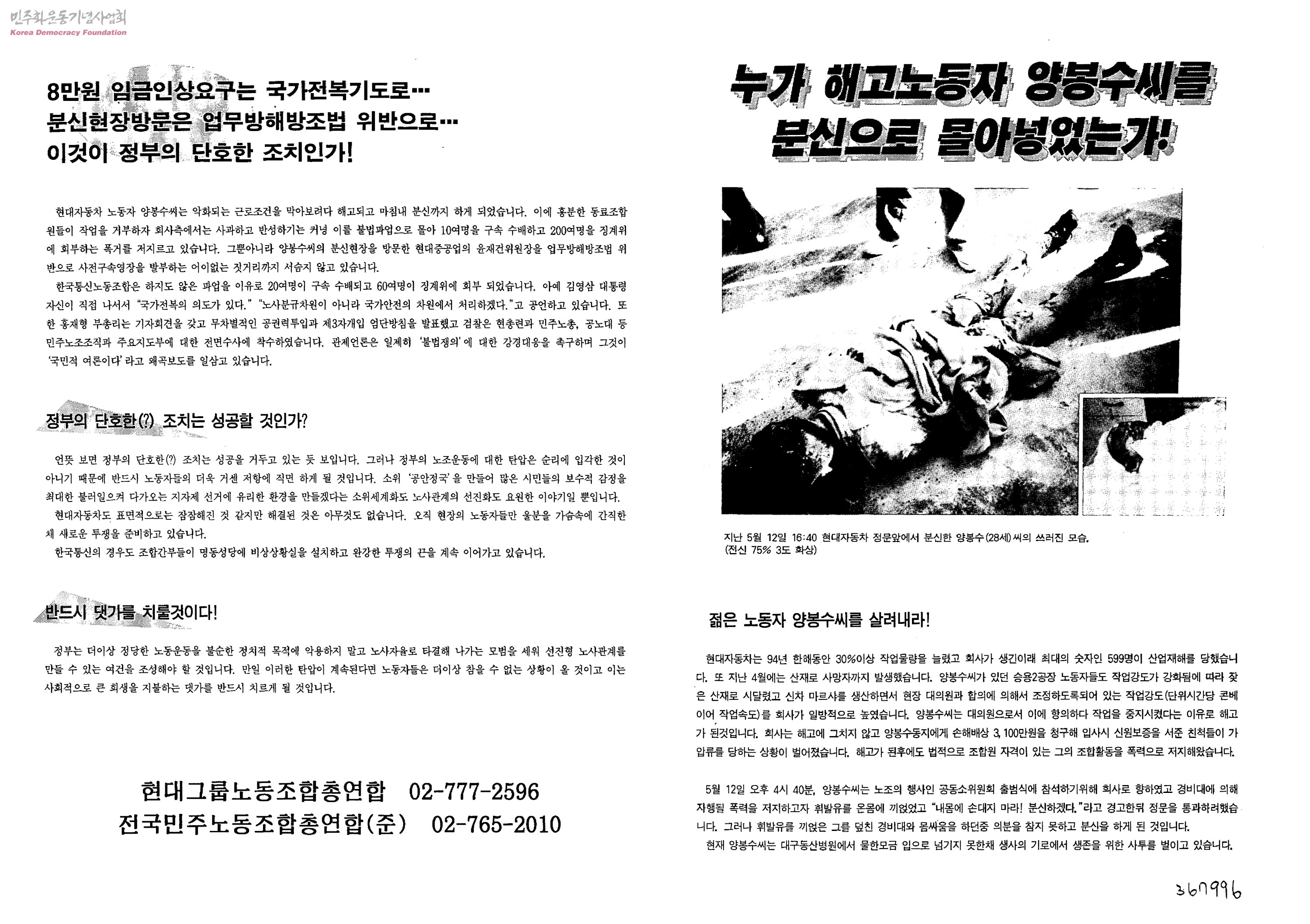 - 노동탄압을 중지하고 산업재해를 줄이는 것이 세계화의 첫걸음 작업량 증가와 산재에 맞서 싸우던 현대자동차의 양봉수 동지가 분신했습니다. 산업재해로 인한 총경제손실이 노사분규로 인한 손실에 2~3배에 달합니다. 구속,수배,해고 노동운동탄압중지, 산업재해없는 생산현장을 만드는 것이 세계화의 첫걸음입니다.