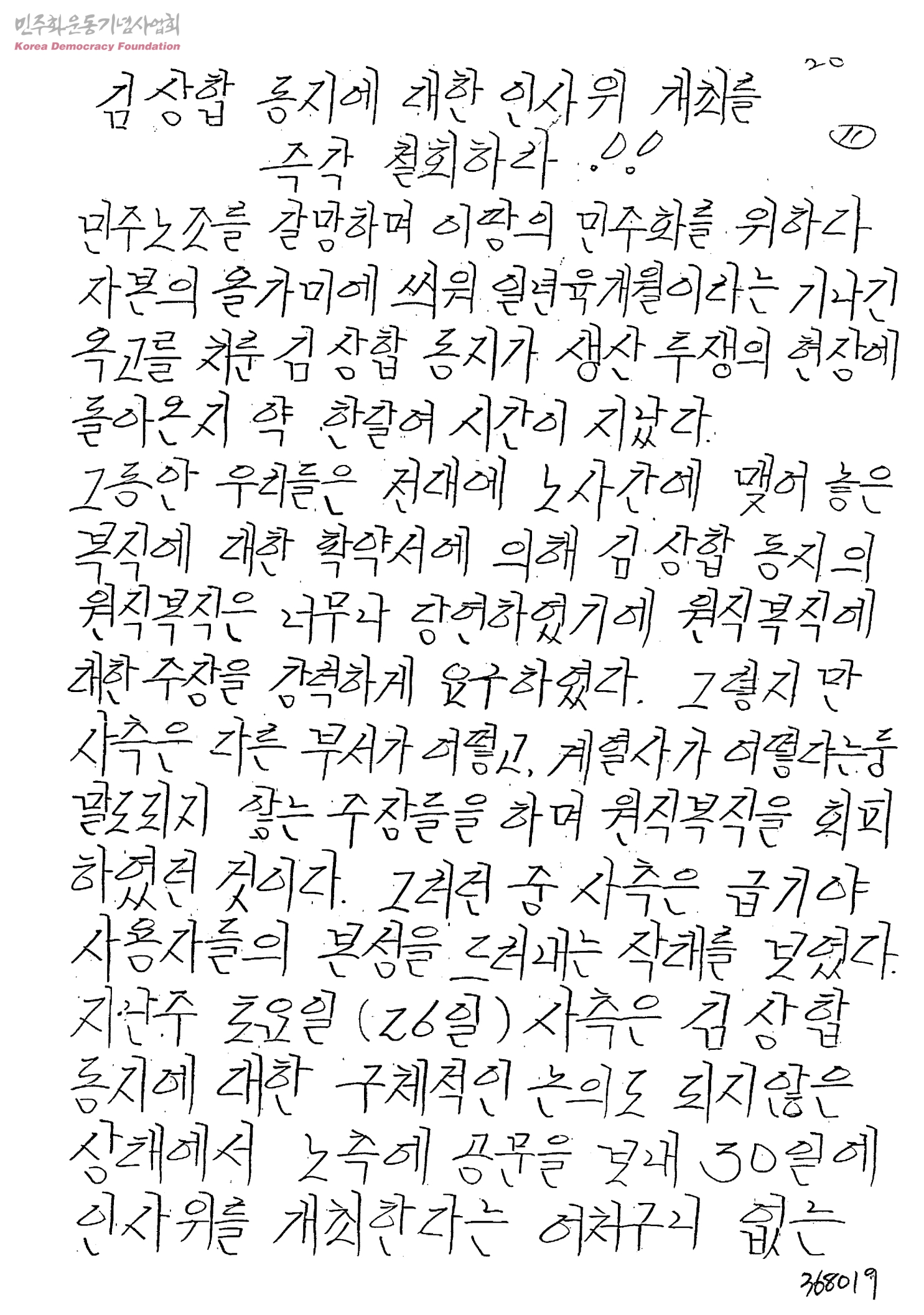 - -김상합 동지의 특별인사위 개최를 철회하라 -김상합 동지를 조기에 원직복직 시켜라 등