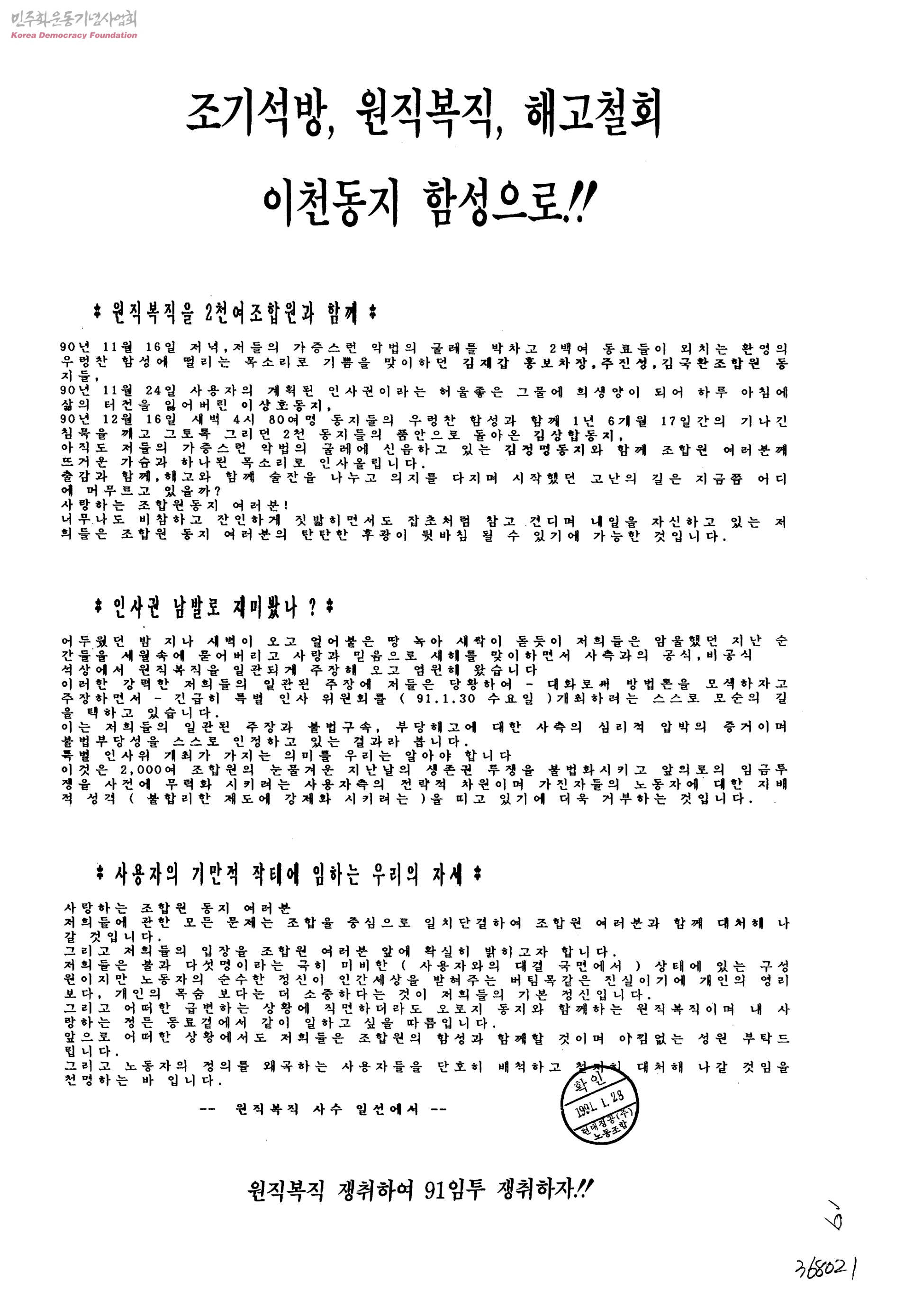 조기석방, 원직복직, 해고철회, 이천동지 함성으로!!
