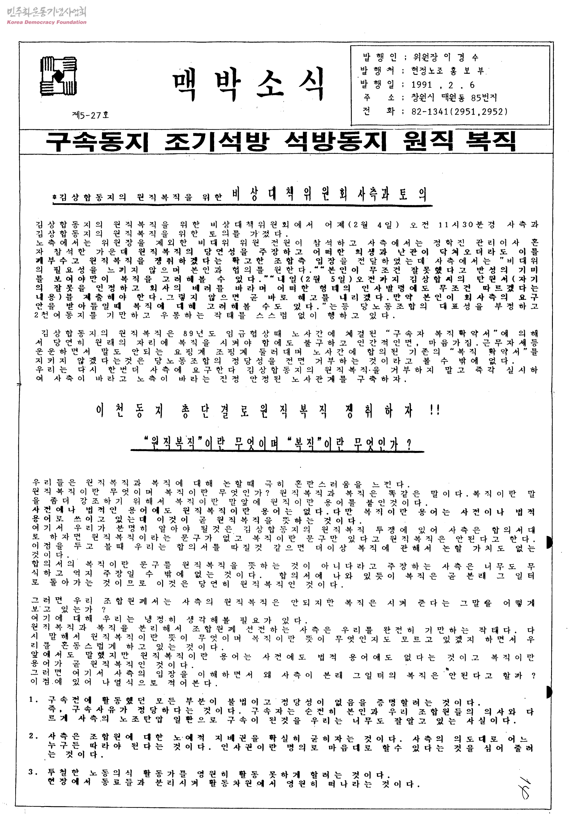 - 1)김상합동지의 원직복직을 위한 비상대책위원회 사측과 토의 2)원직 복직이란 무엇이며 복직이란 무엇인가 3)김상합동지 원직복직을 위한 제반서류 사측에 전달 4)이상호동지 해고무효소송 2월7일 첫 공판