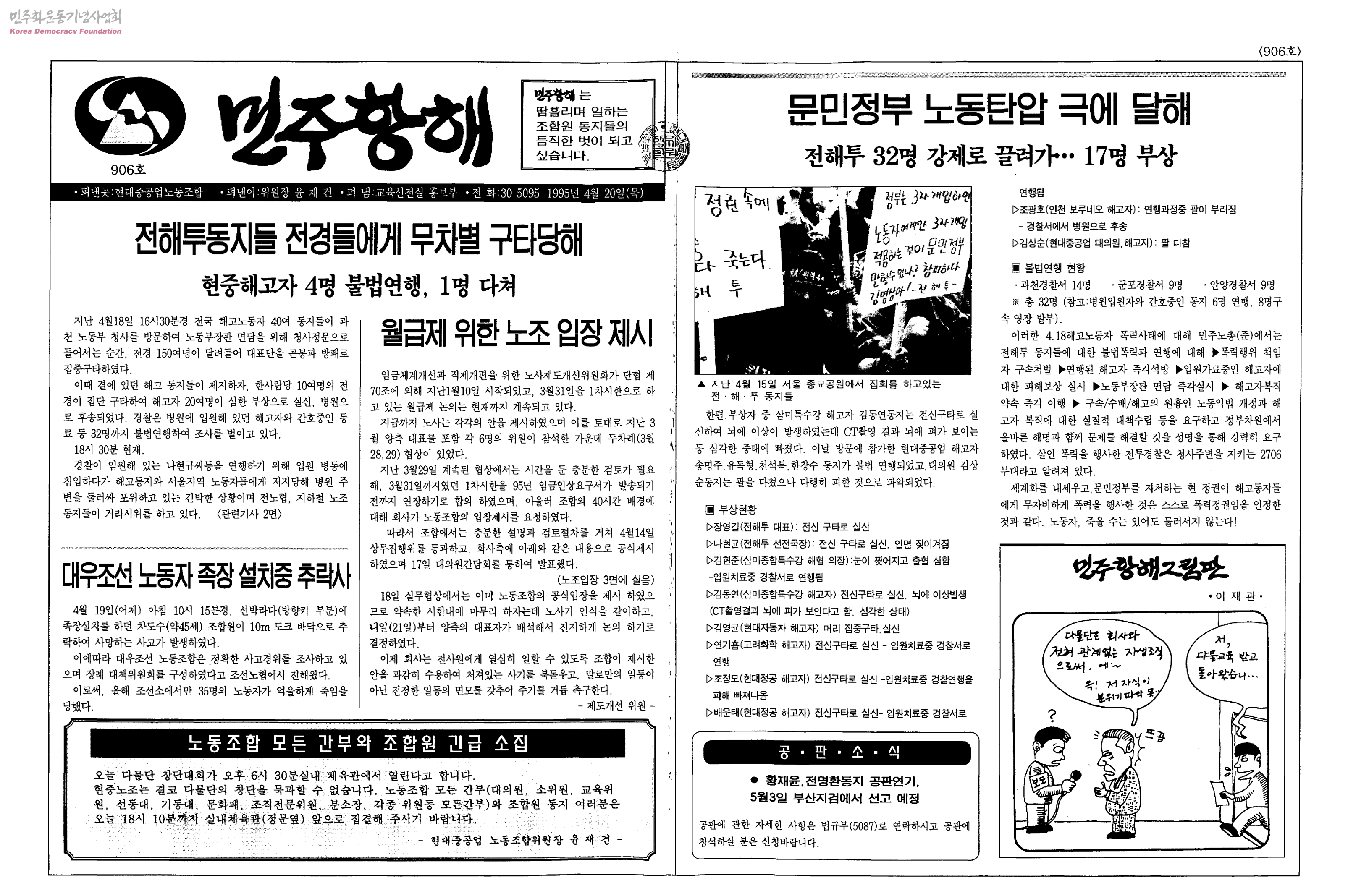 - 1)전해투동지들 전경들에게 무차별 구타당해 2)문민정부 노동탄압 극에 달해 3)95임투 닻 올랐다 26일 임금요구안 확정, 28일 발송식 4)목숨걸고 차에 매달려 출근하는 해양2공장 등