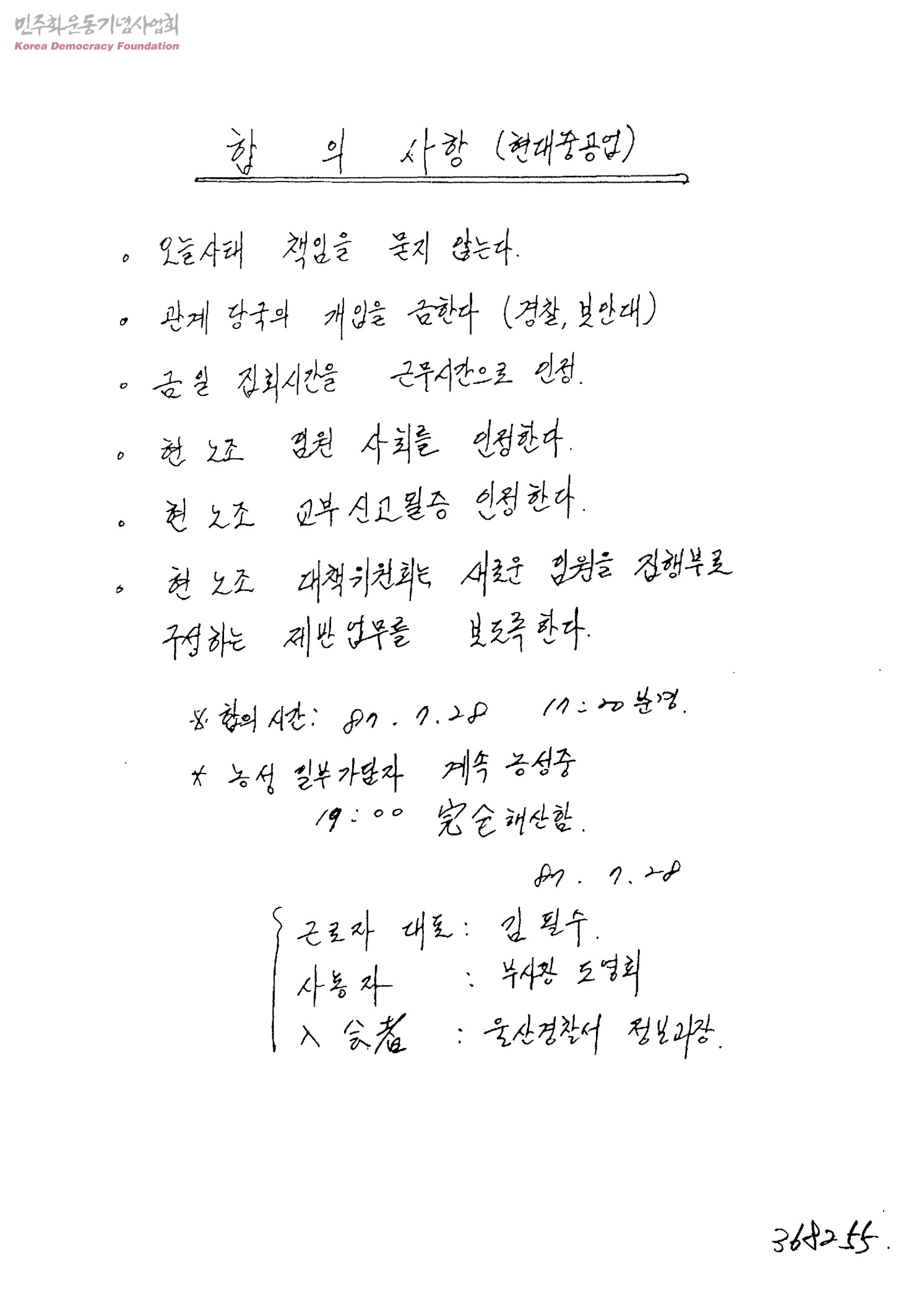 - 합의사항 1)오늘사태의 책임을 묻지않는다 2)관계당국의 개입을 금함 3)금일 집회시간을 근무시간으로 인정 4)현노조 임원사퇴를 인정 5)현 노조 교부신고필증 인정 6)현노조 대책위원회는 새로운 임원을 집행부로 구성