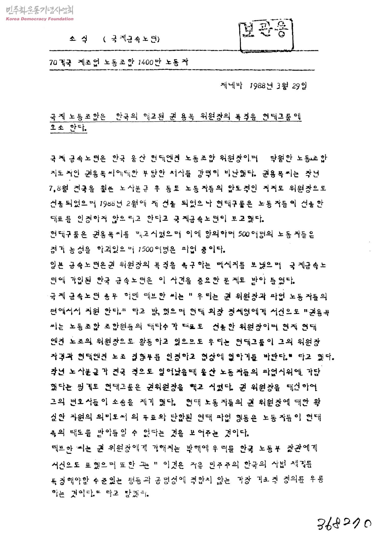 소식(국제금속노련)-국제노동조합은 한국의 해고된 권용목 위원장의 복직을 현대그룹에 호소 한다[INTERNATIONAL METALWORKERS' FEDERATION이 생산한 NEWS RELEASE의 해석본과 그 원본]