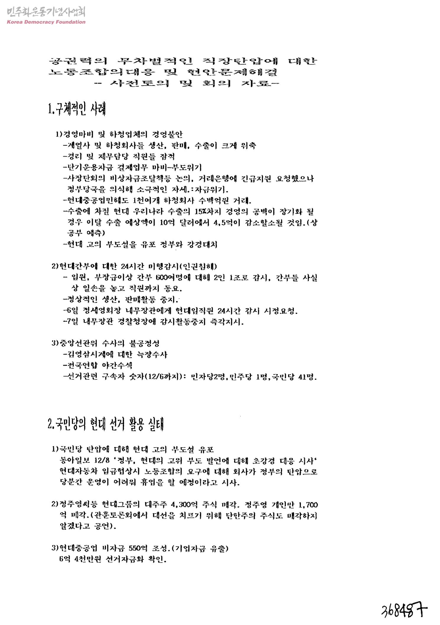 - 1)구체적인 사례 2)국민당의 현대 선거 활동 실태 3)언론의 분위기 4)조합원의 정서 5)각계의 의견 6)위원장단 국민당사 방문과 관련 해결해야할 문제 7)그간의 논의 전개와 경과 8)앞으로의 진행에 대한 의견