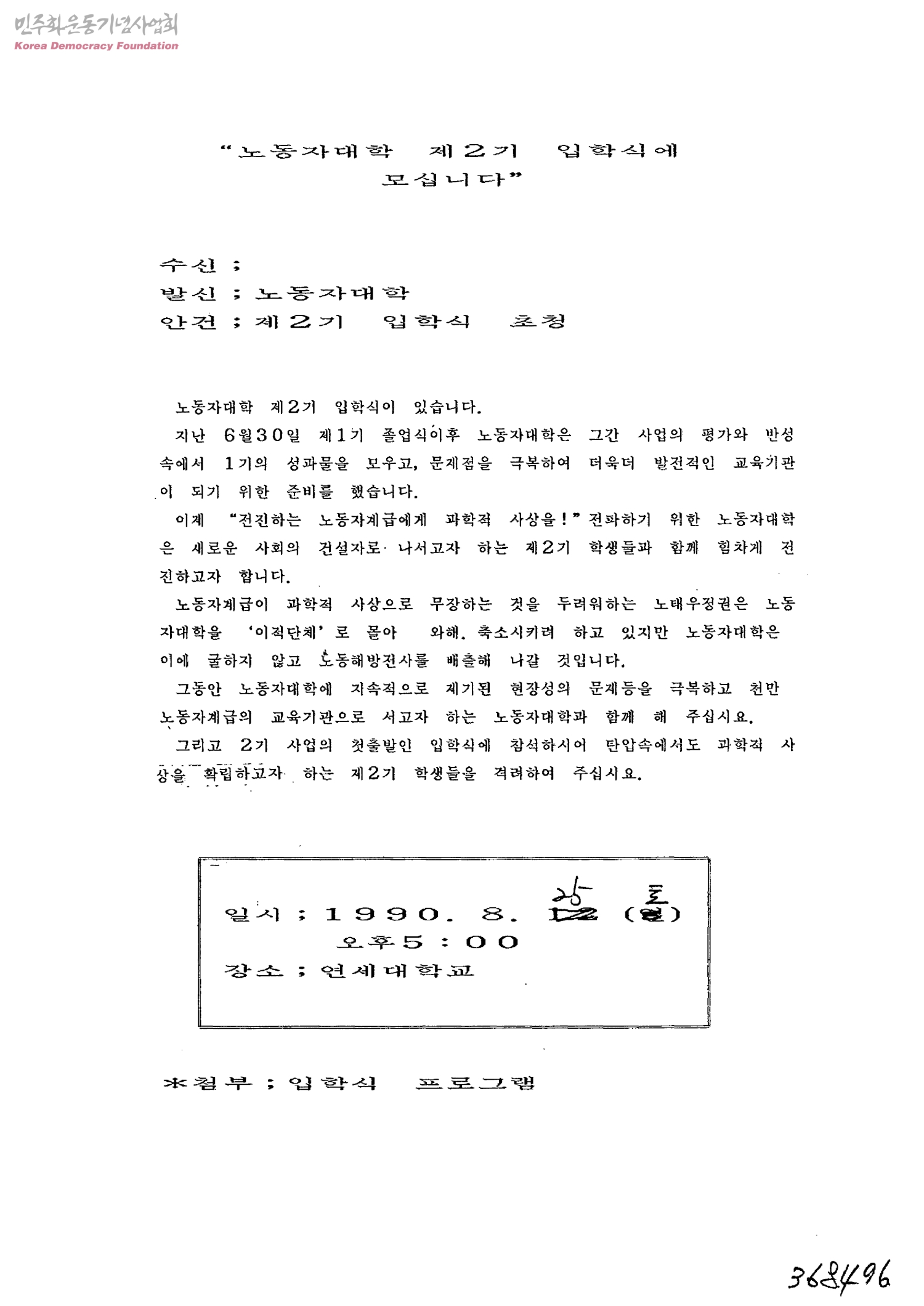 노동자대학 제2기 입학식에 모십니다-제2기 입학식 초청[수신:미상, 발신:노동자대학]