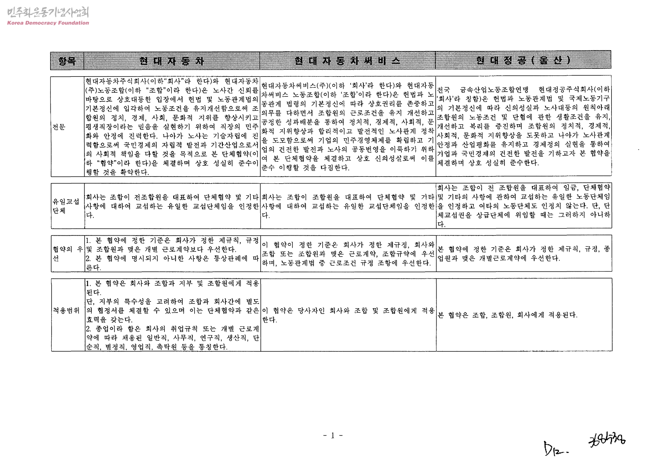 현대자동차,현대자동차써비스,현대정공(울산)의 단체교섭문 비교