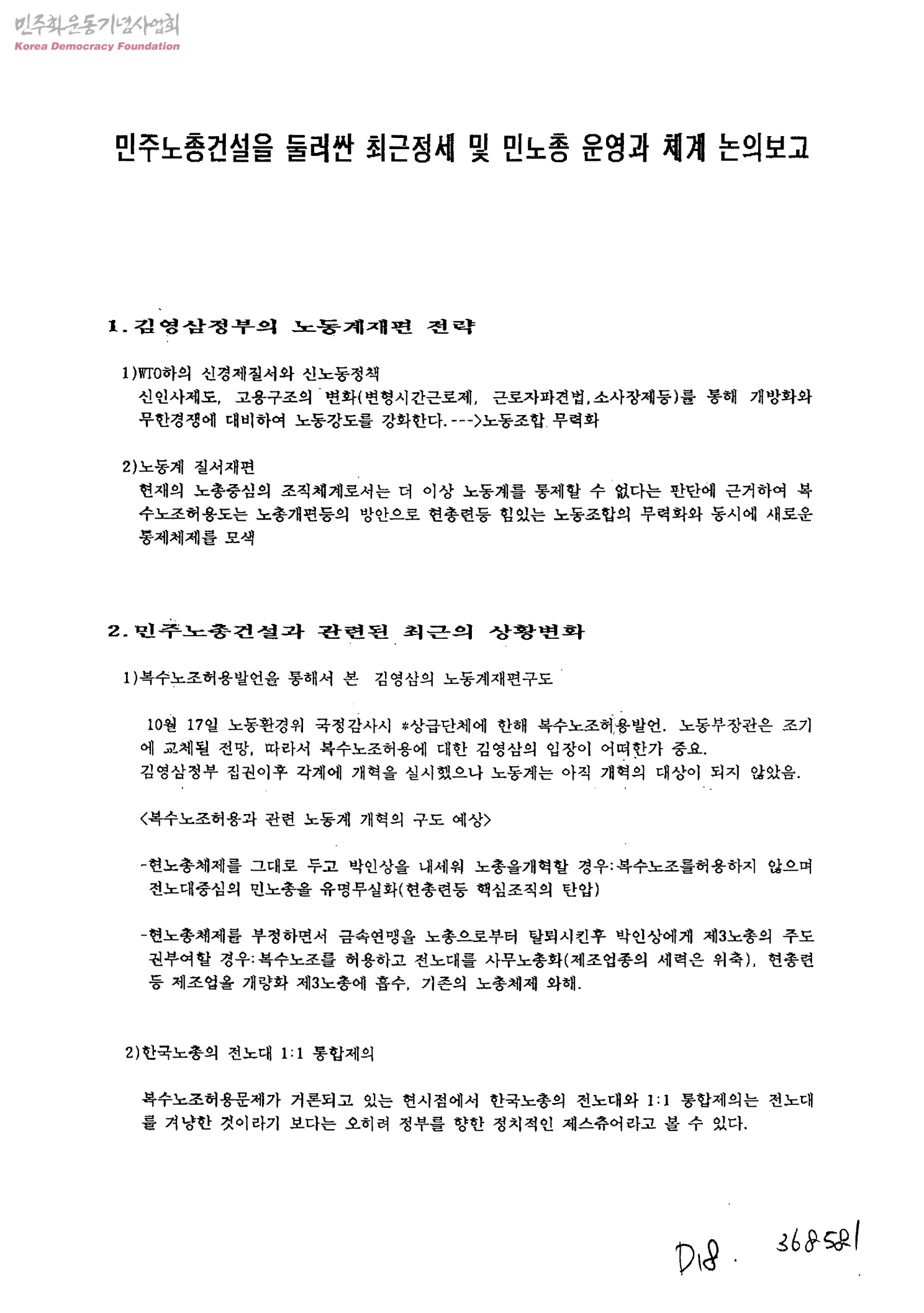 - 1)김영삼정부의 노동계재편 전략 2)민주노총건설과 관련된 최근의 상황변화 3)민노총관련 전노대 내의 움직임 4)민주노총의 운영과 체계에 관한 논의 5)조직발전전망과 관련된 향후 현총련 대책