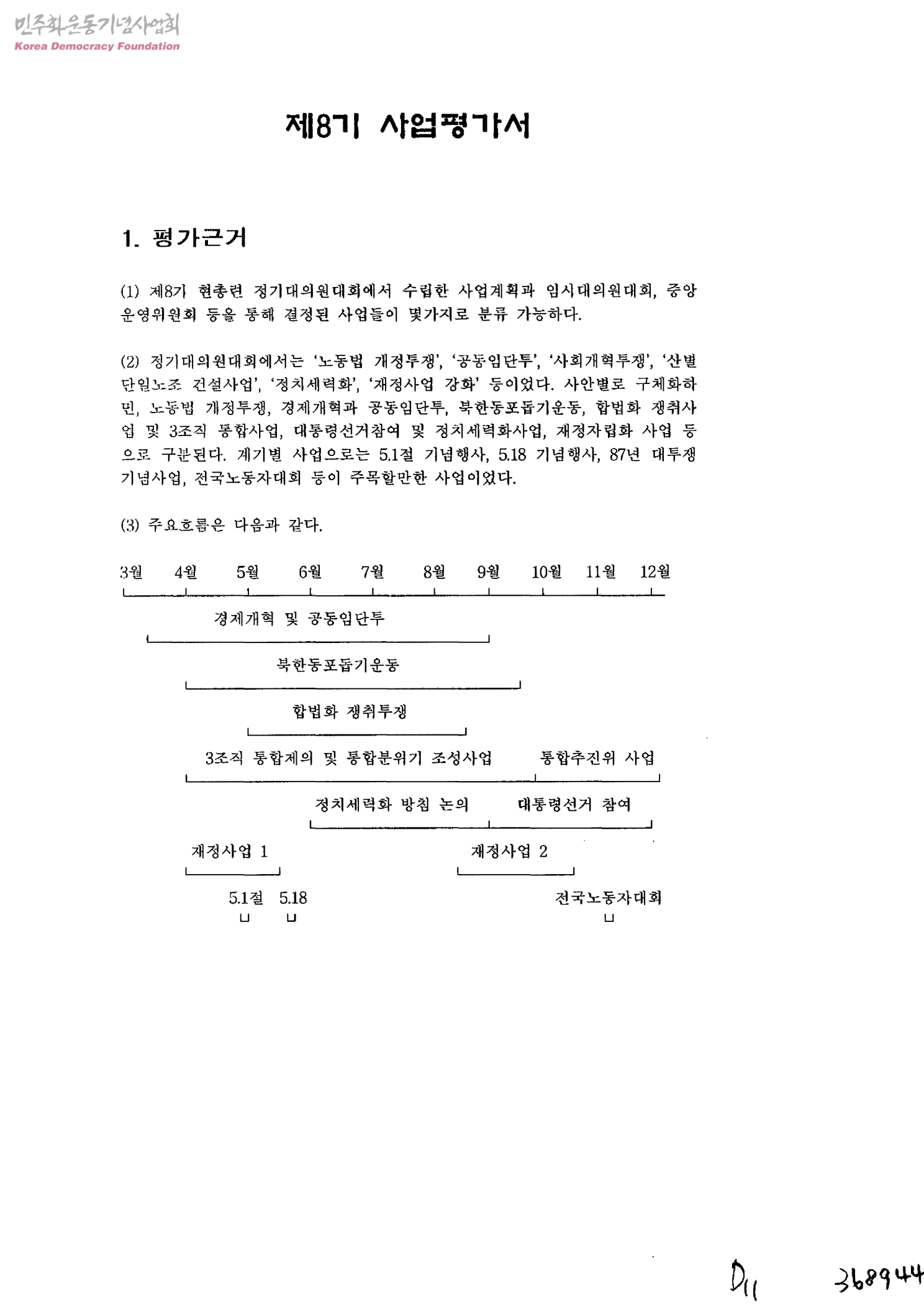 - 1.평가근거 2.사업별 평가 (1)경제개혁과 공동임단투 (2)북한동포돕기운동 (3)대통령선거 참여 및 정치세력화 (4)경제주권수호와 민중생존권 사수 및 고용안정을 위한 투쟁 (5)합법화 쟁취사업 및 3조직 통합사업 (6)재정자립화 사업(후생복지부서의 자체 평가서 참조) 3.총평