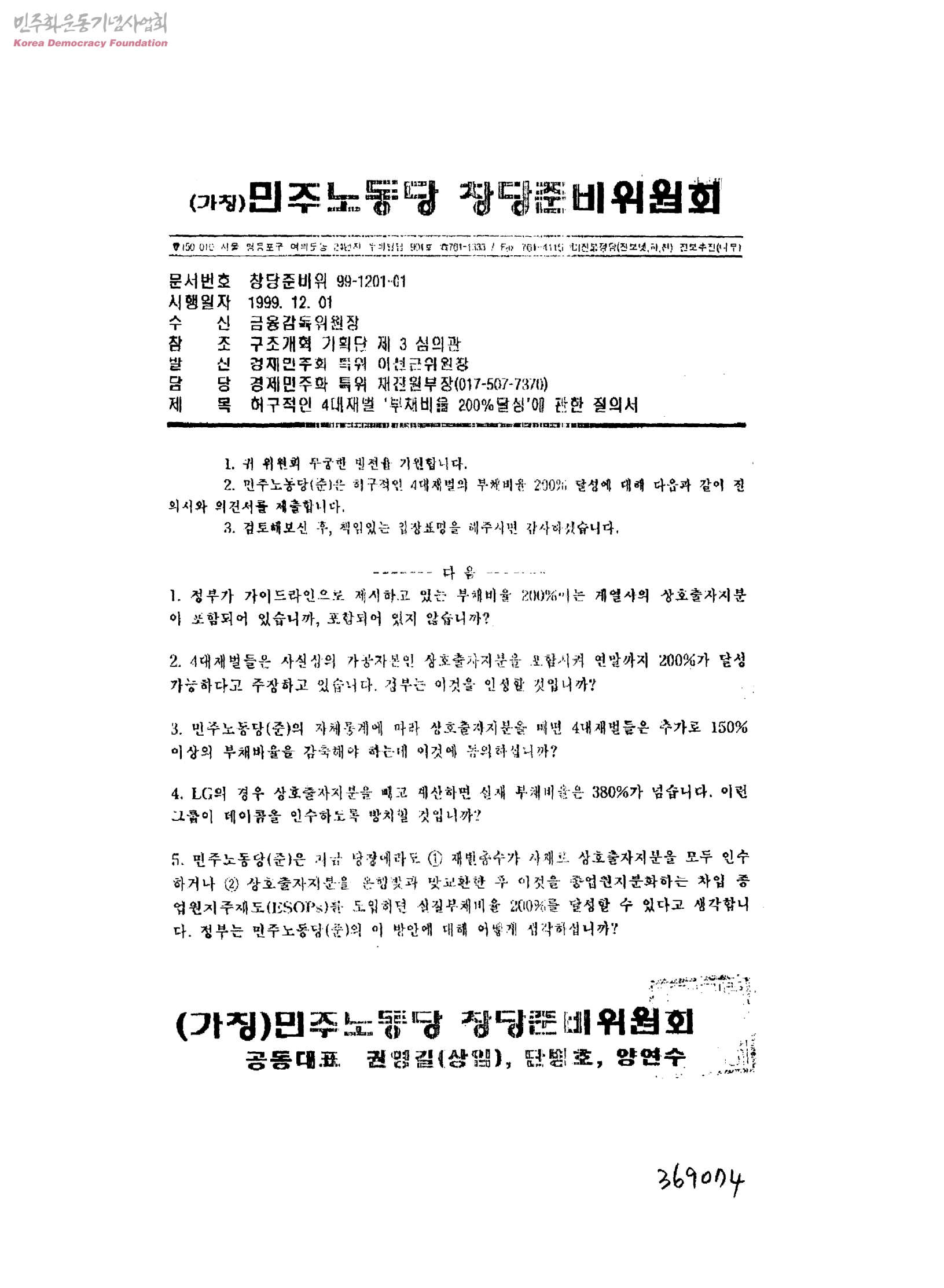 허구적인 4대재벌 '부채비율 200%달성'에 관한 질의서[수신:금융감독위원장, 발신:경제민주화 특위 이선근위원장]