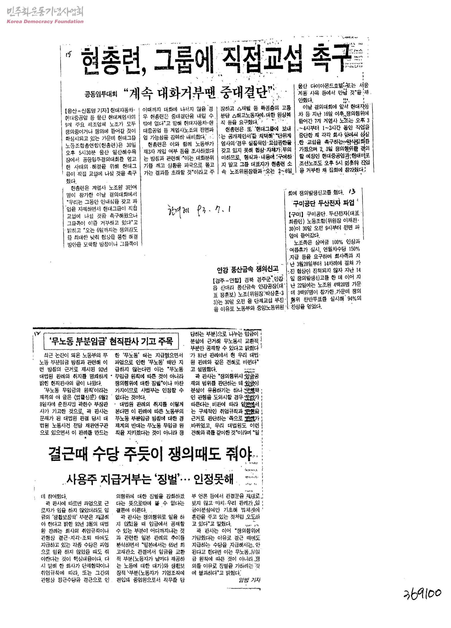 - -.5월 경상수지 올 첫흑자(한겨레 93.7.1) -.현대 매출피해 2천4백억(매일경제 93.7.1) -.新造船가격 회복세(매일경제 93.7.1) -.현대노사 전면전 양상(매일경제 93.7.1) -.30大그룹總師, 청와대 초청에 희색-정부-재계 대화회복 기대(동아일보 93.7.1) -.현총련집회강행 분규 악화(동아일보 93.7.1) -.시헙대 오른 정부노동정책(동아일보 93.7.1) -.현총련 어제 공동임투대회 강행-협상결렬땐 전면파업(한국일보 93.7.1) -.현대노사 정면대결 양상(서울경제 93.7.1) -.현총련 2만명 집회강행(조선일보 93.7.1) -.전그룹파업 배수진 강경공세(한국일보 93.7.1) -.현총련간부 사법처리(내외경제 93.7.1) -.현총련, 회사측에 대화제의-거부하면 7일 중대결단(중앙일보 93.7.1) - 사설-현대 노사에 다시 촉구한다.(중앙일보 93.7.1) -.서울민사지법 소장 판사 40명 사법부 개혁촉구 성명(중앙일보 93.7.1) -.소장판사 사법부개혁 의견서 요약(중앙일보 93.7.1) -.법 지키는 노사분규 노동부 공노(부산일보 93.6.30) -.현총련 공투결의 긴장고조(부산일보 93.6.30)