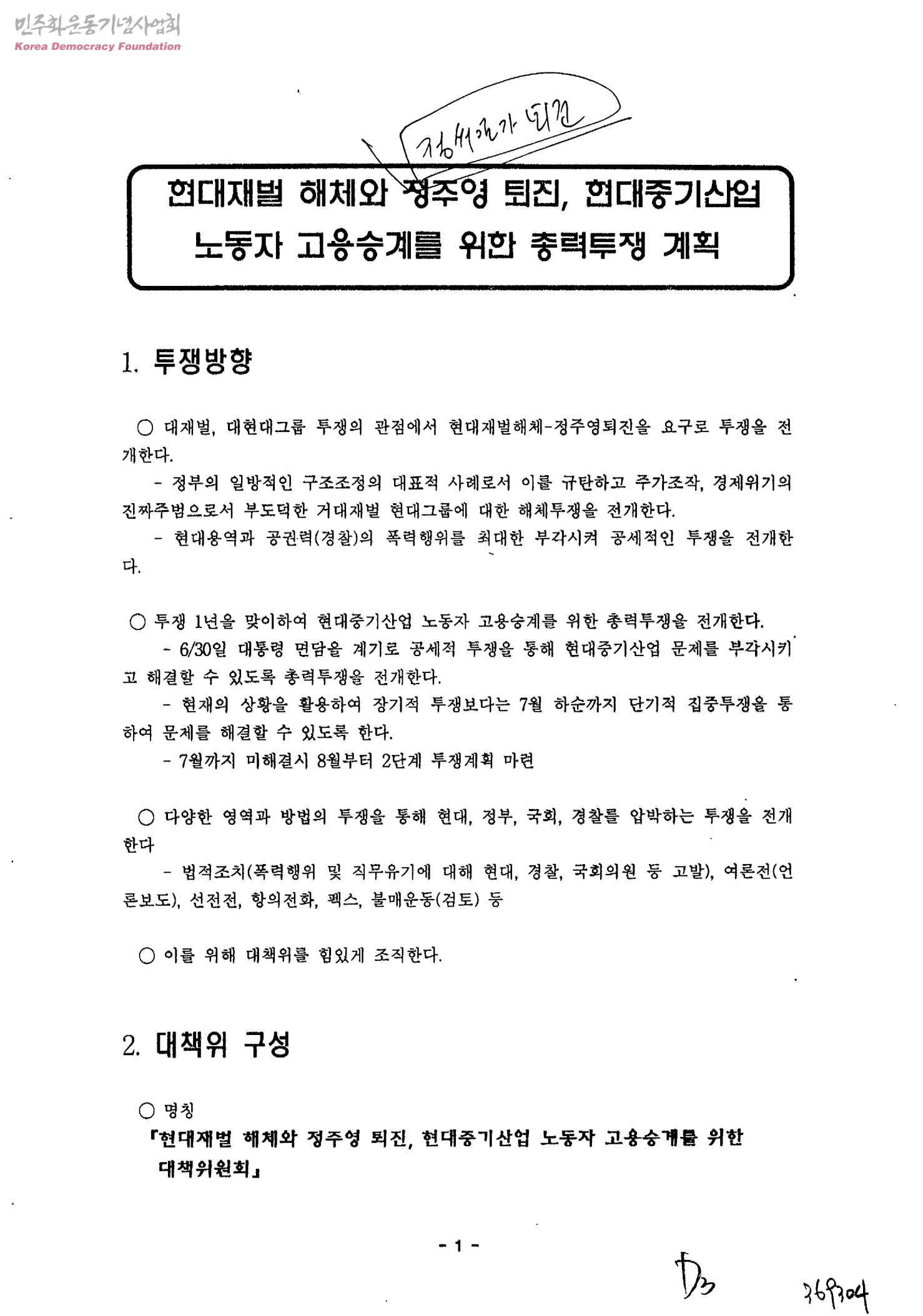현대재벌 해체와 정주영 퇴진, 현대중기산업 노동자 고용승계를 위한 총력투쟁 계획