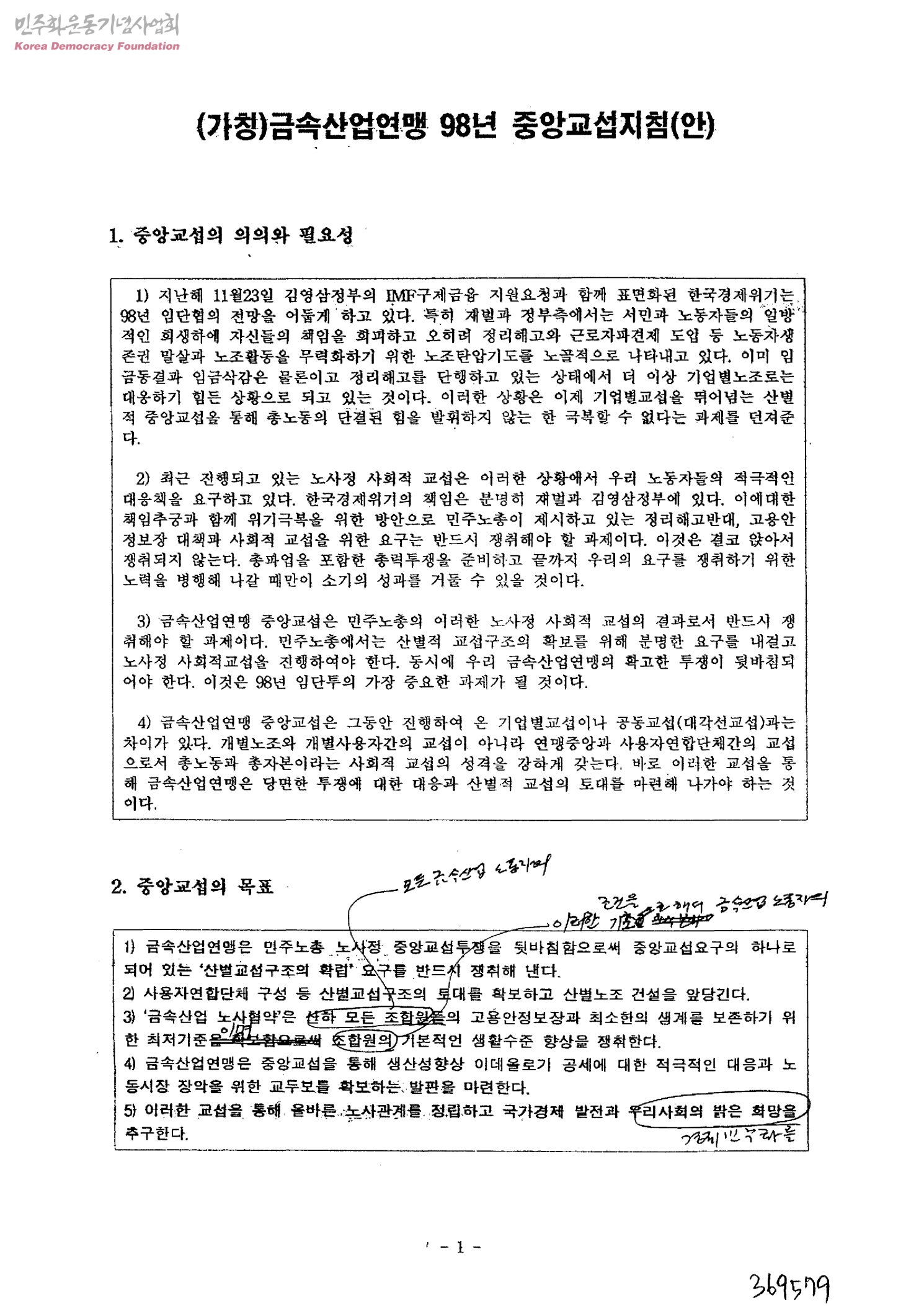 - 금속산업연맹 98임.단협 요구서:요구안 전달에 부쳐/중앙교섭 요구(안)/단위노조 보충교섭 요구(안)/교섭권 위임 통보