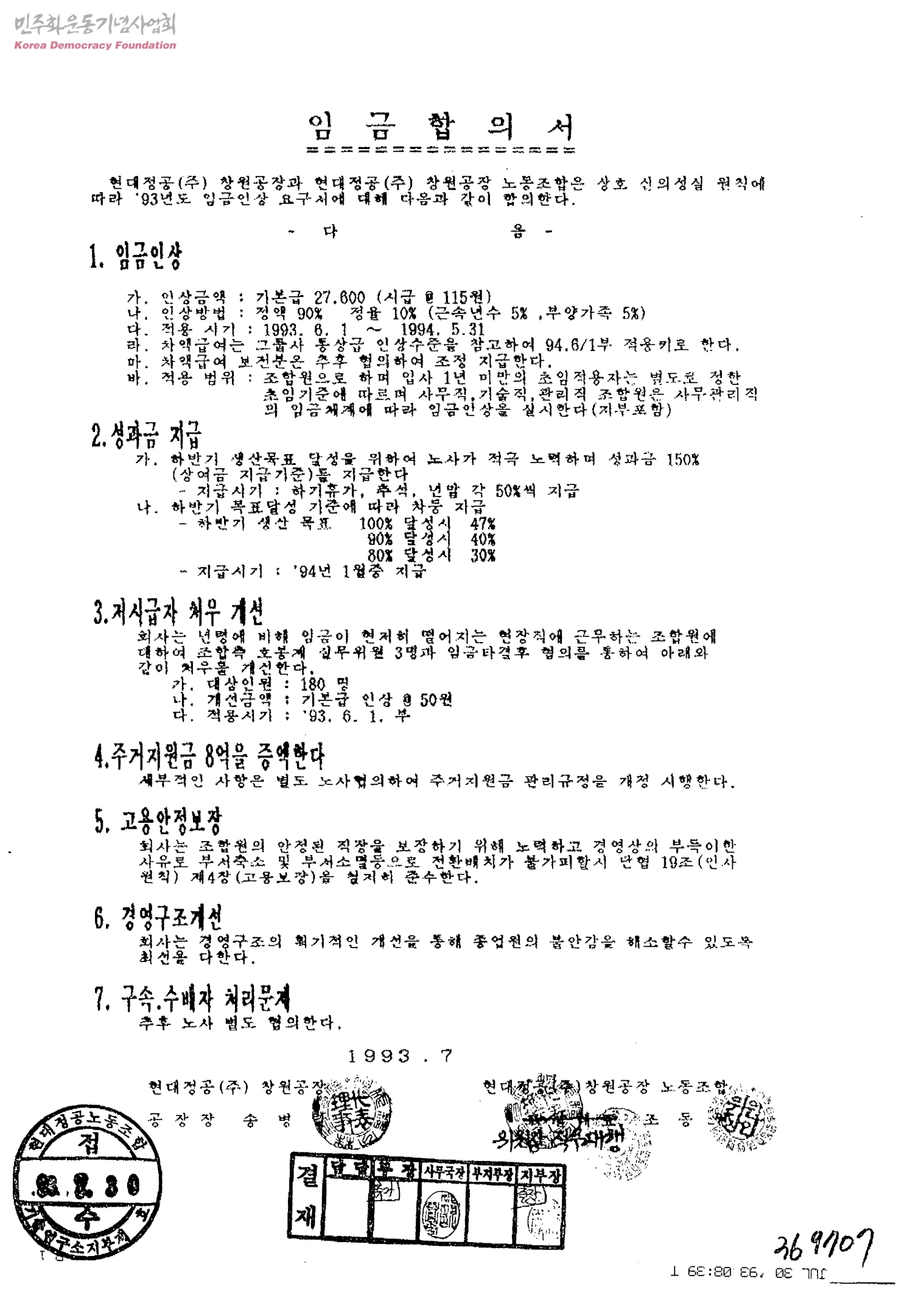 - 현대정공창원공장, 현대정공창원공장노동조합은 상호 신의성실 원칙에 따라 '93년도 임금인상 요구서에 대해 합의한다.