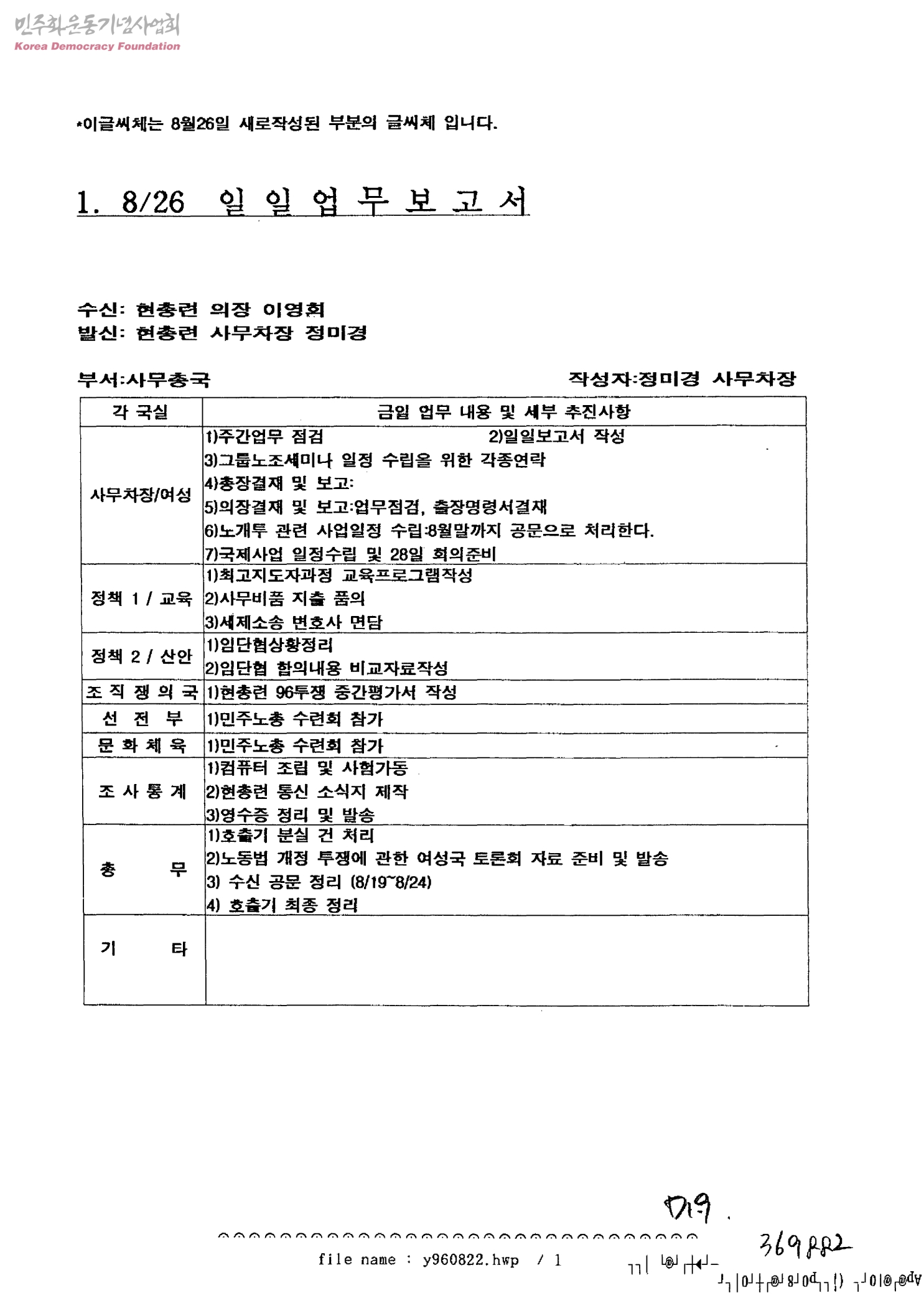8/26 일일업무 보고서[수신:현총련 의장 이영희, 발신:현총련 사무차장 정미경]