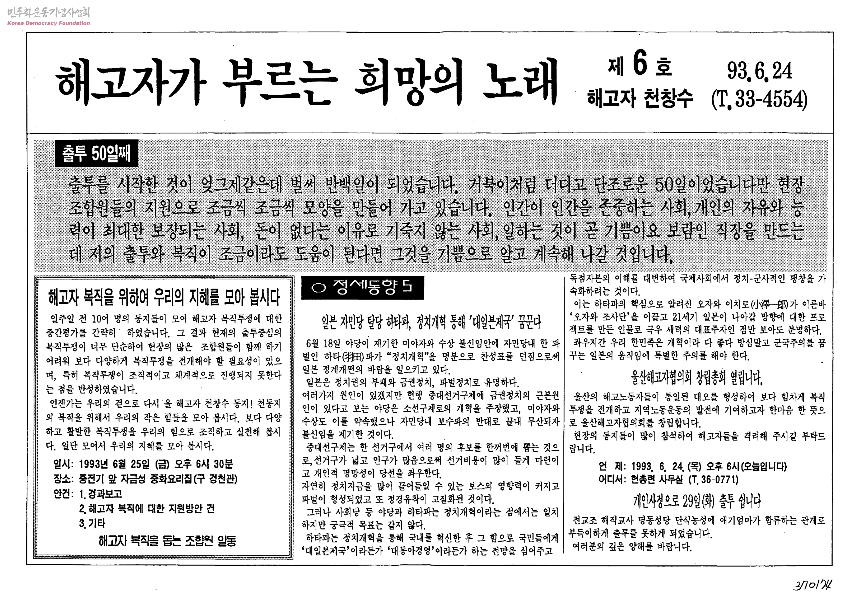 - - 정세동향5: 일본 자민당 탈당 하타파, 정치개혁 통해 '대일본제국' 꿈꾼다 - 울산해고자협의회 창립총회 개최 - 내 청춘 중전기에 묻고 제3회