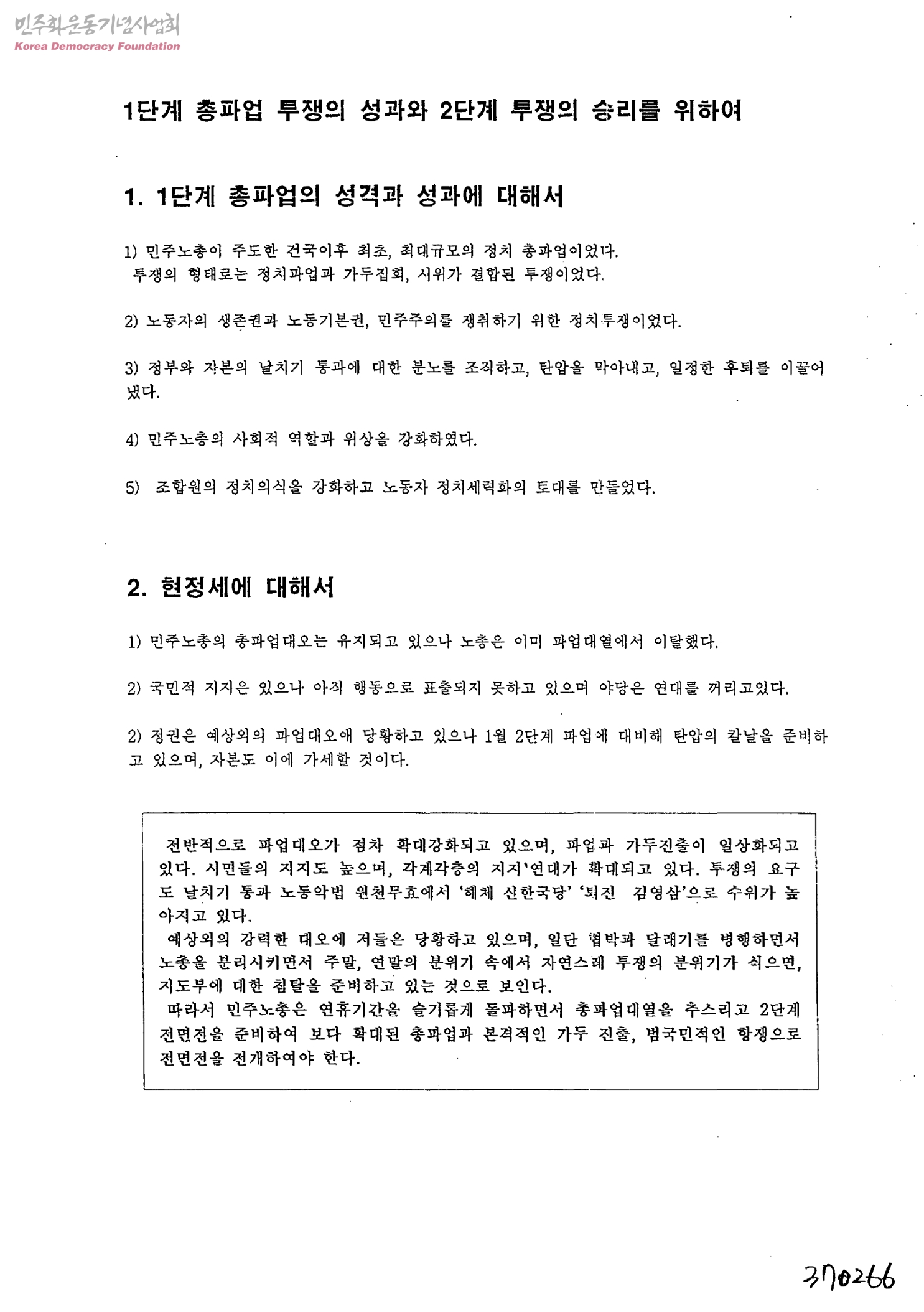 - 1.1단계 총파업의 성격과 성과에 대해서 2.현정세에 대해서 3.2단계 총파업 투쟁의 승리를 위해서 4.구체적 전술
