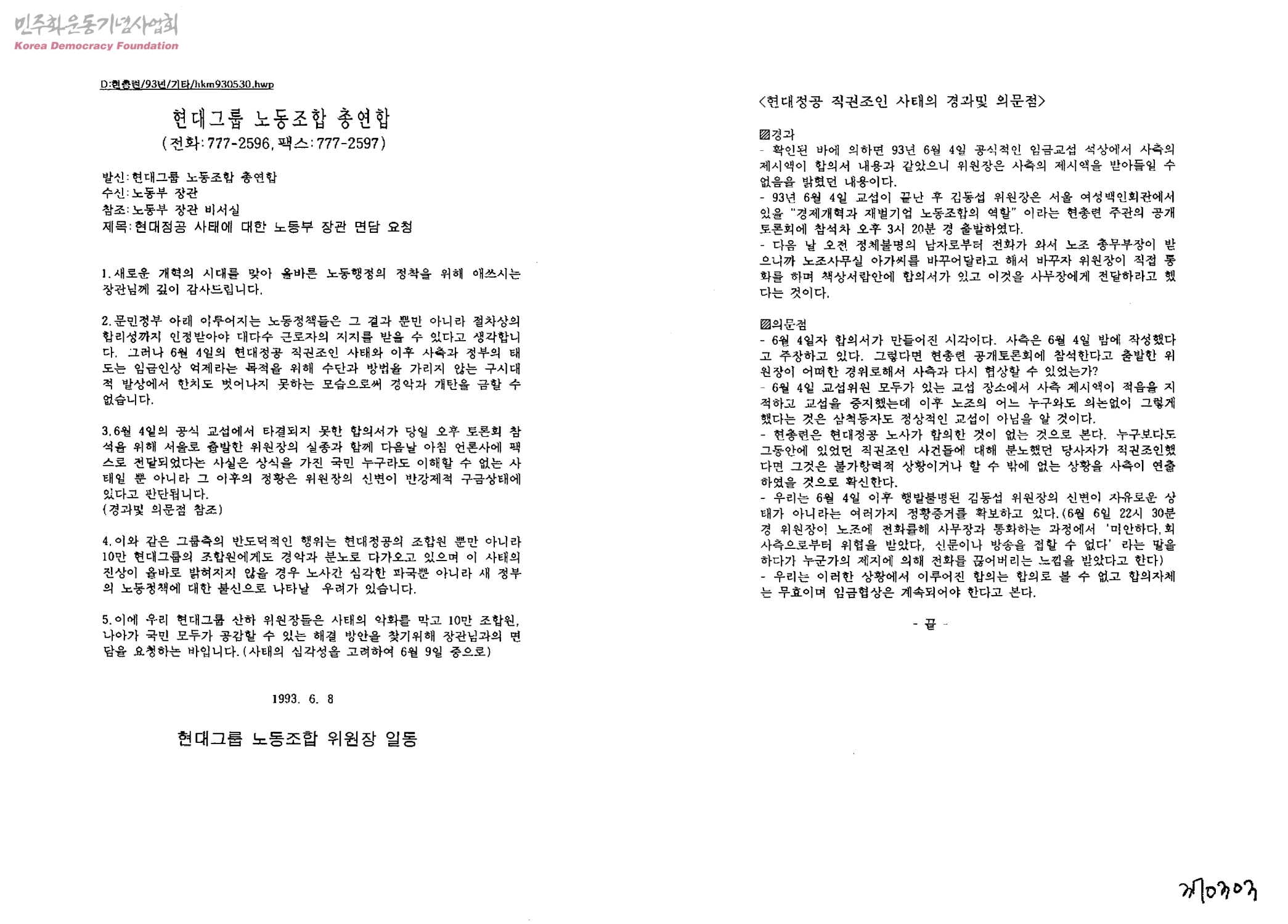 현대정공 사태에 대한 노동부 장관 면담 요청[수신: 노동부 장관, 발신: 현대그룹노동조합위원장]