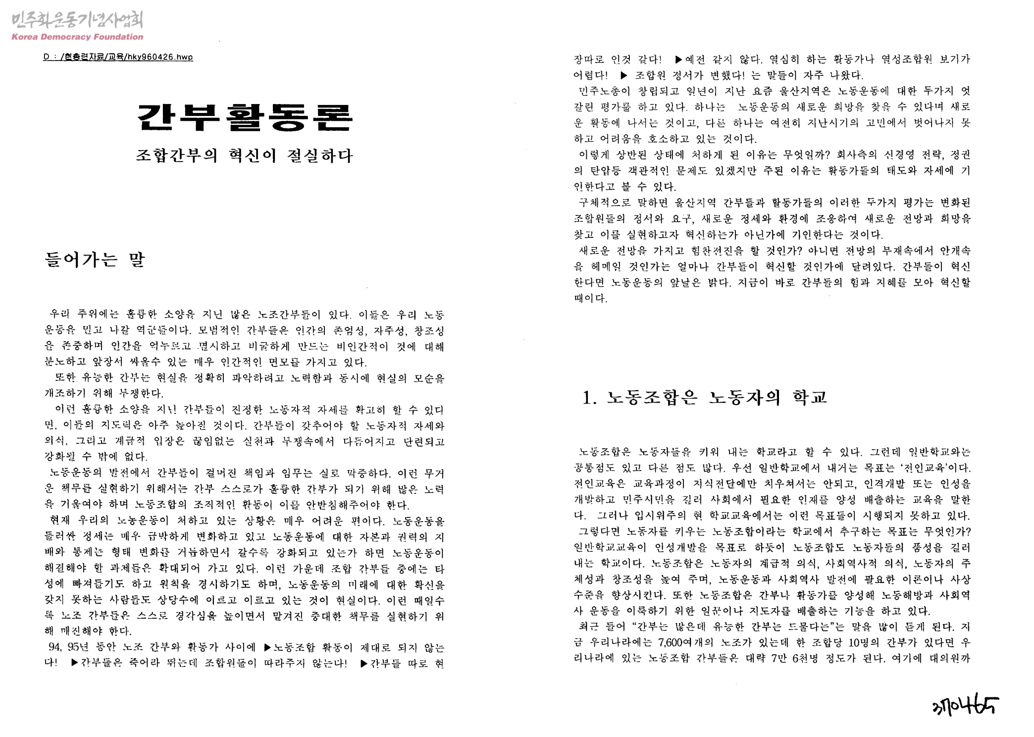 - 들어가는 말 1.노동조합은 노동자의 학교 2.노동조합 간부의 의의와 위상 3.조합 간부들은 어떠한 일을 해야 하나 4.노동조합 간부의 입장과 자세 5.현시기 간부들에게 특히 요구되는 활동 마치는 말