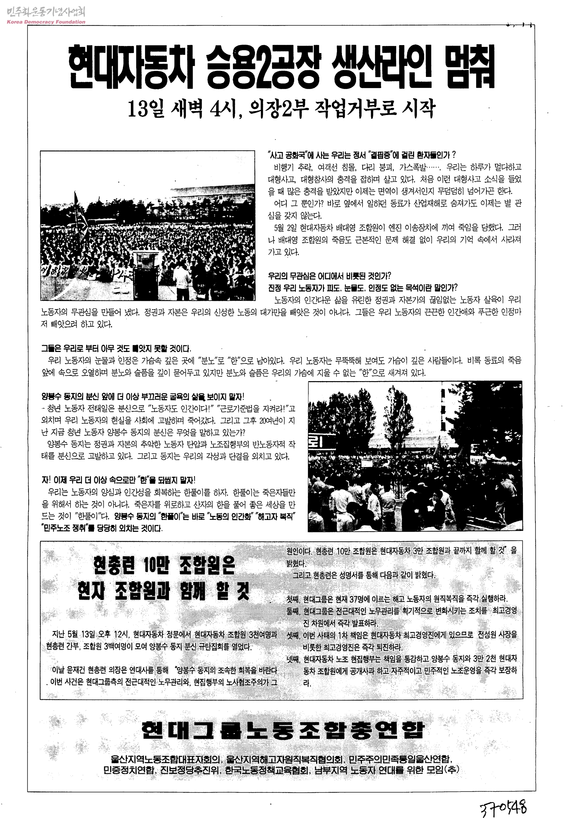 - 현대자동차 해고 노동자 양봉수씨 분신 전신 3도 90% 화상 위독 / 현대자동차 승용2공장 생산라인 멈춰 등