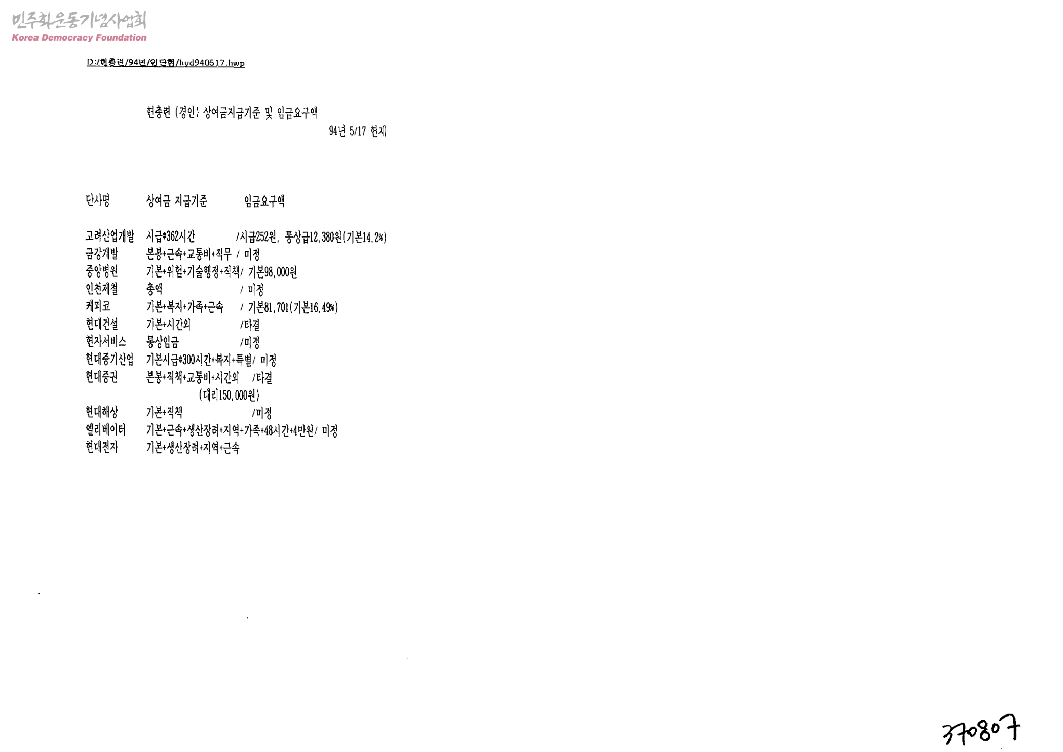 현총련(경인)상여금지급기준 및 임금요구액